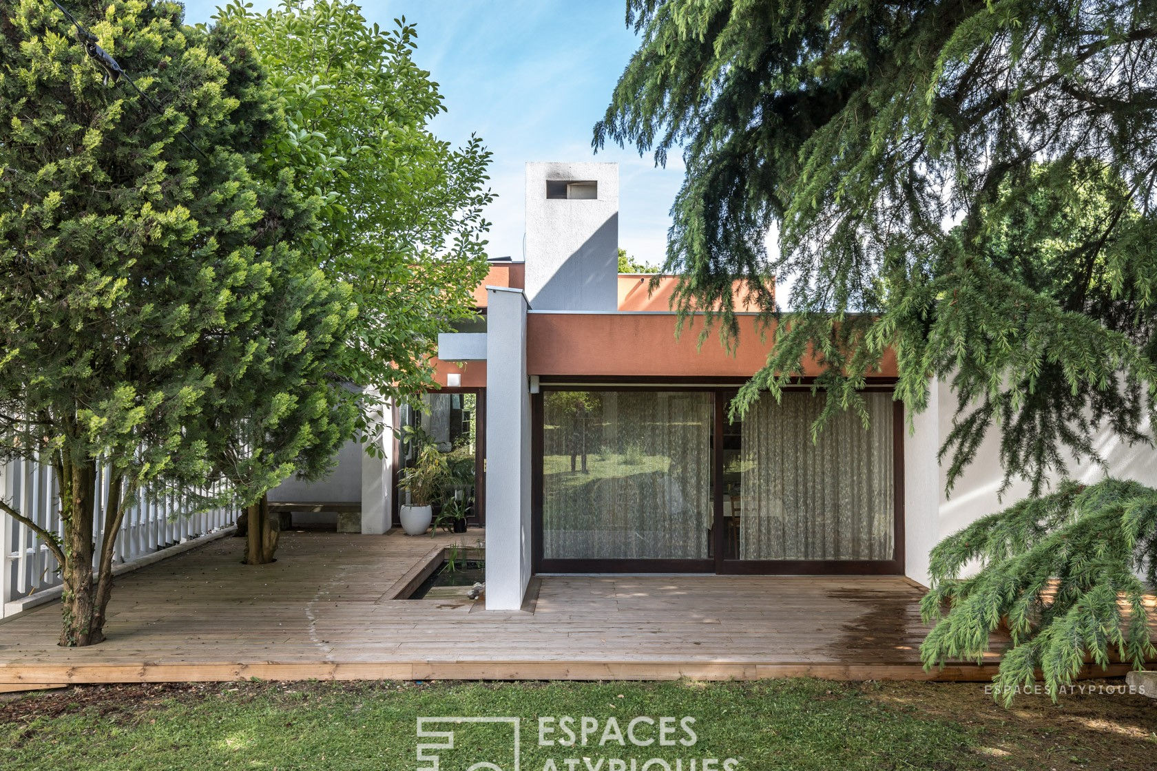 Située à la lisière du parc de Sceaux, dans une zone résidentielle à proximité immédiate des transports, commerces et écoles (Lycée et Collège Lakanal, école d’ingénieurs EPF – Campus Parisien, Université Paris I), une superbe maison d’architecte à la ligne épurée et moderniste construite en 1971 offrant 340 m2 sur un terrain arboré de 1 500 m2.