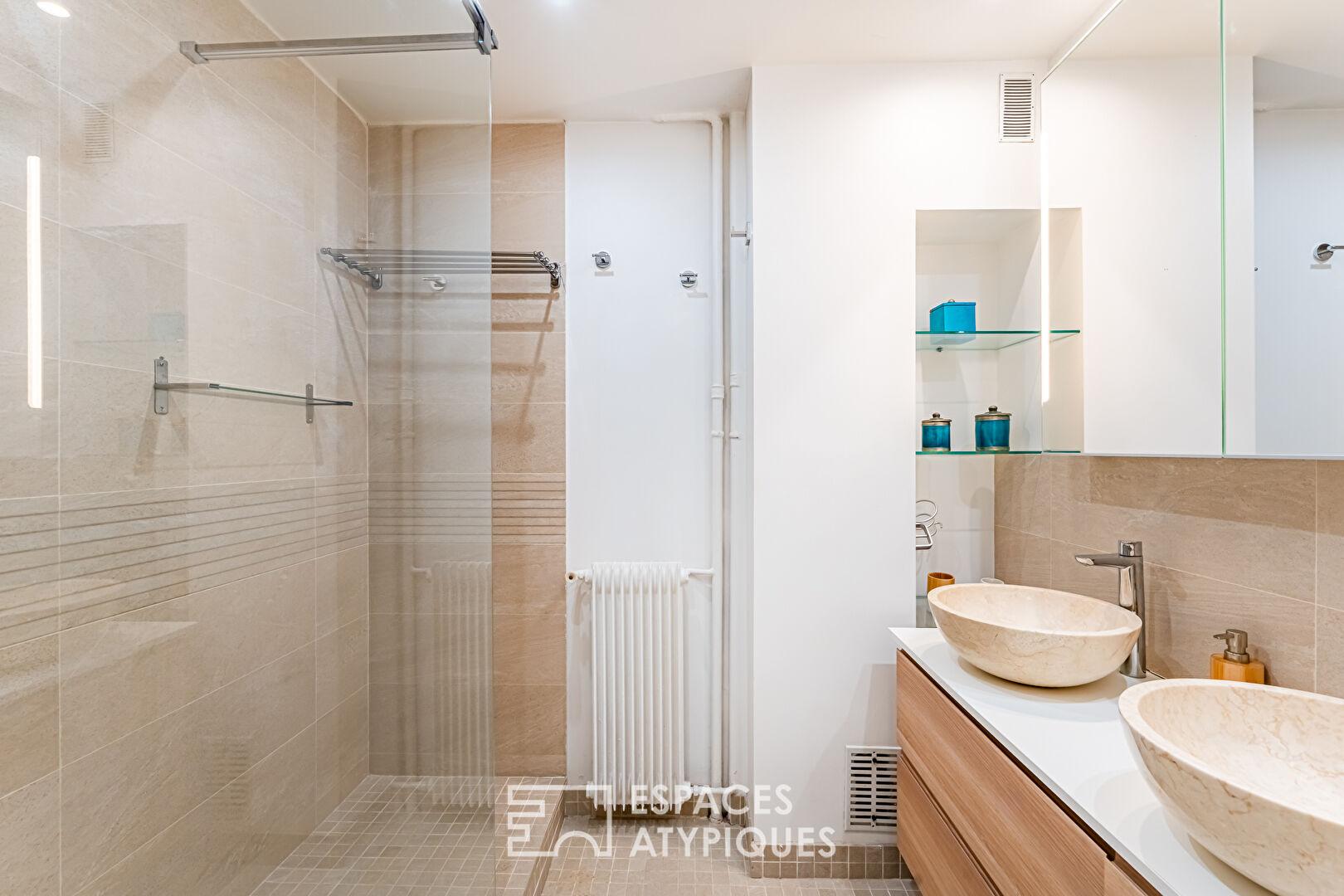 L’entrée dessert d’un côté le séjour, de l’autre une cuisine équipée, une salle d’eau avec douche à l’italienne et double vasque, ainsi que de nombreux rangements intégrés et des toilettes indépendantes.