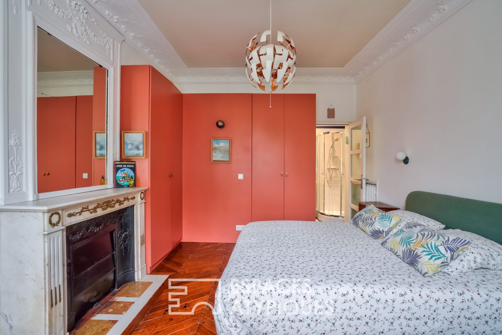 La rénovation de qualité, le parquet, les moulures et la cheminée confèrent à ce lieu de vie une ambiance chaleureuse.