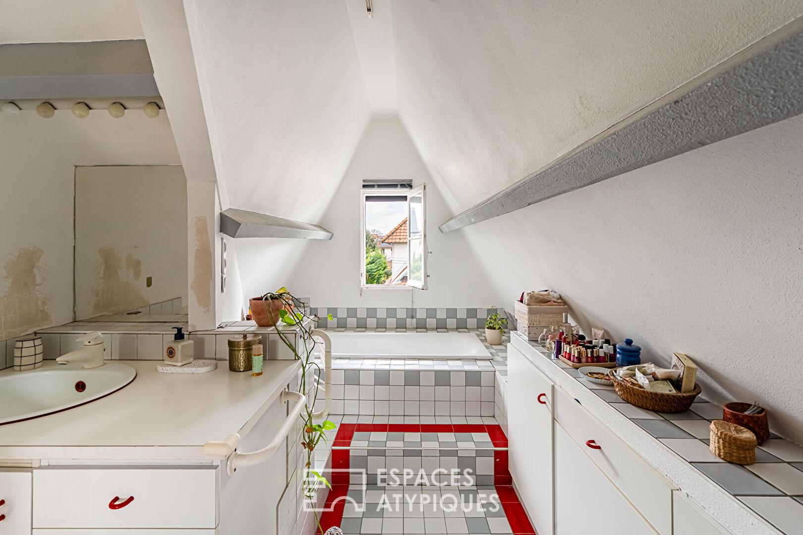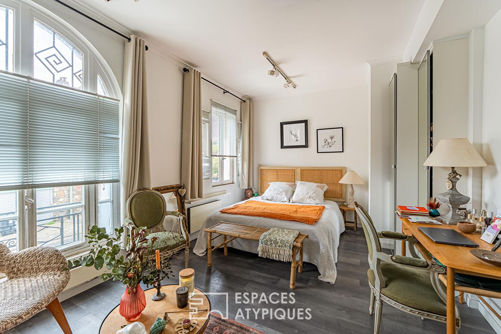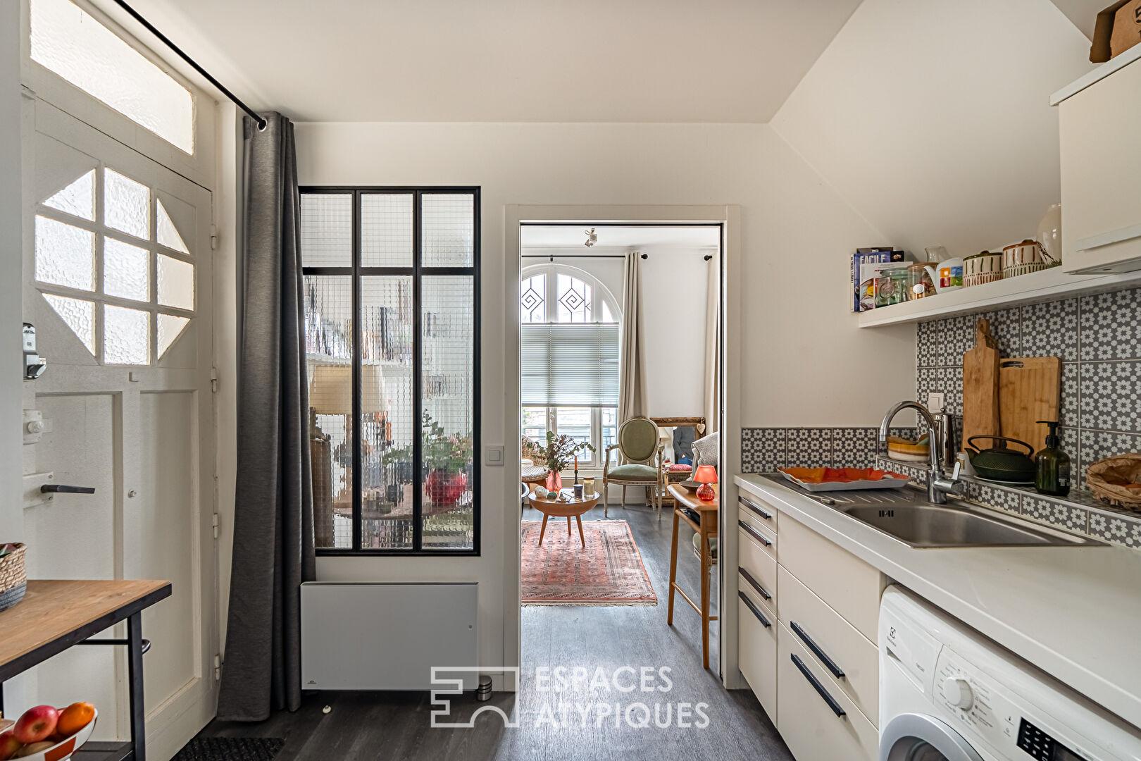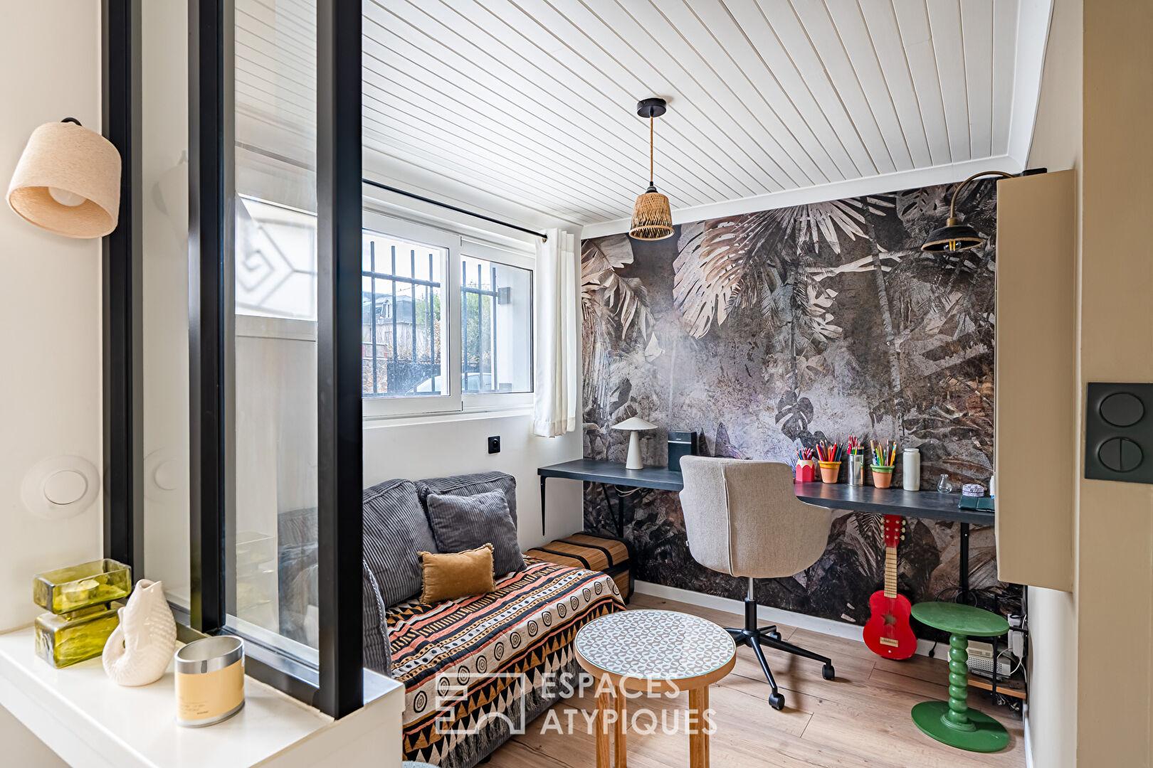 Ce cocon est situé dans une zone pavillonnaire prisée pour son calme et sa proximité immédiate avec le centre-ville de Colombes. Cette maison ancienne rénovée dévoile une architecture typique des années 20-30, influencée par le mouvement Art Déco. Ce bien allie le cachet de l’ancien à une rénovation contemporaine et chaleureuse. Sur une surface d’environ 110 m² habitable complétée par un studio indépendant de 28 m² (le tout sur plus de 150m2 au sol), cet bien s’articule autour d’un patio arboré, véritable extension naturelle de la maison.