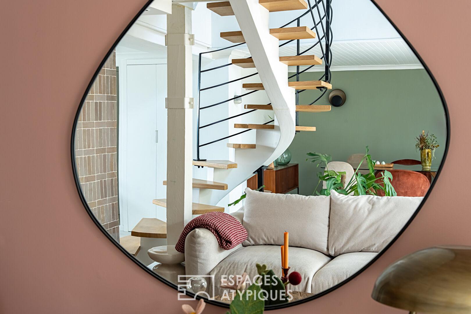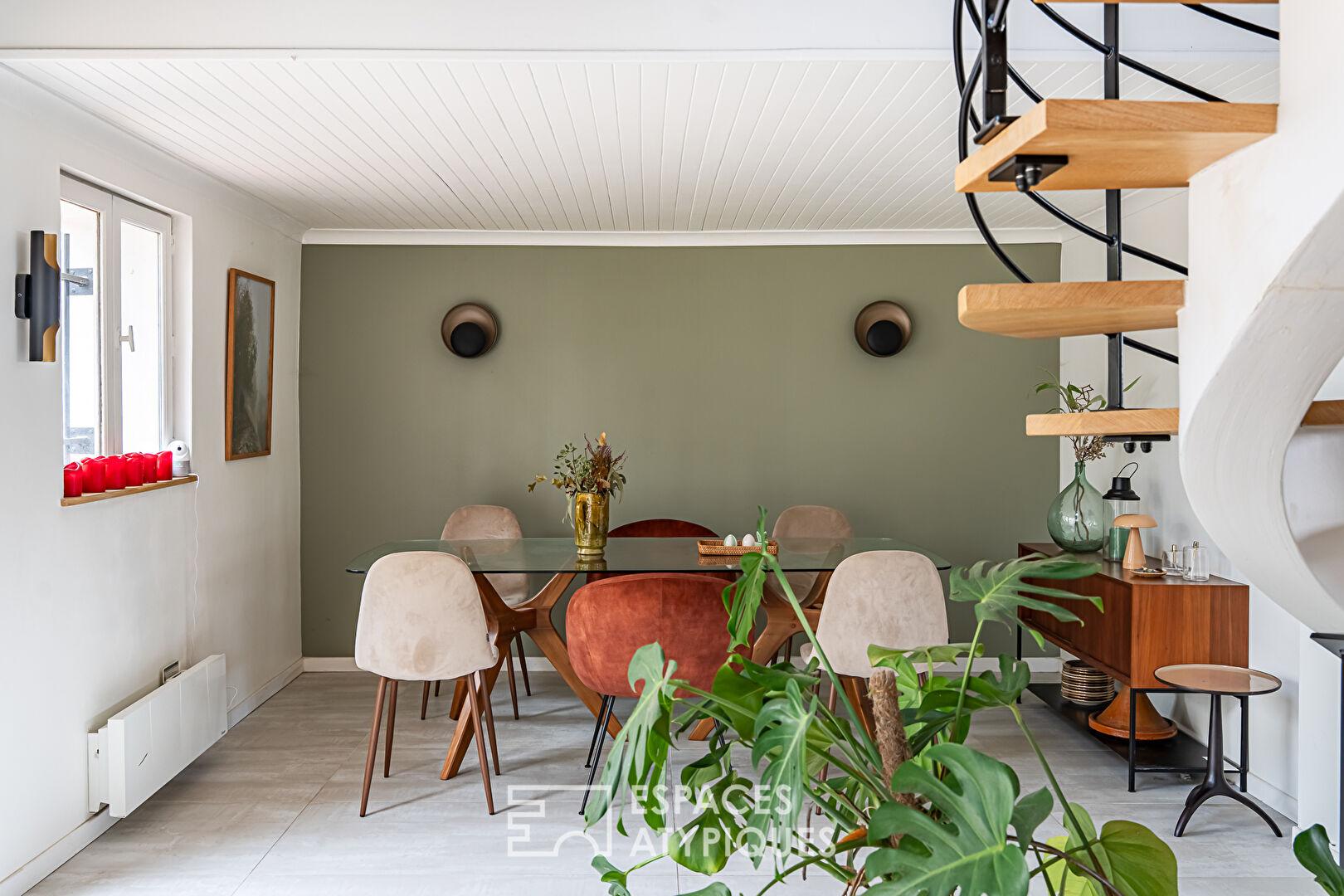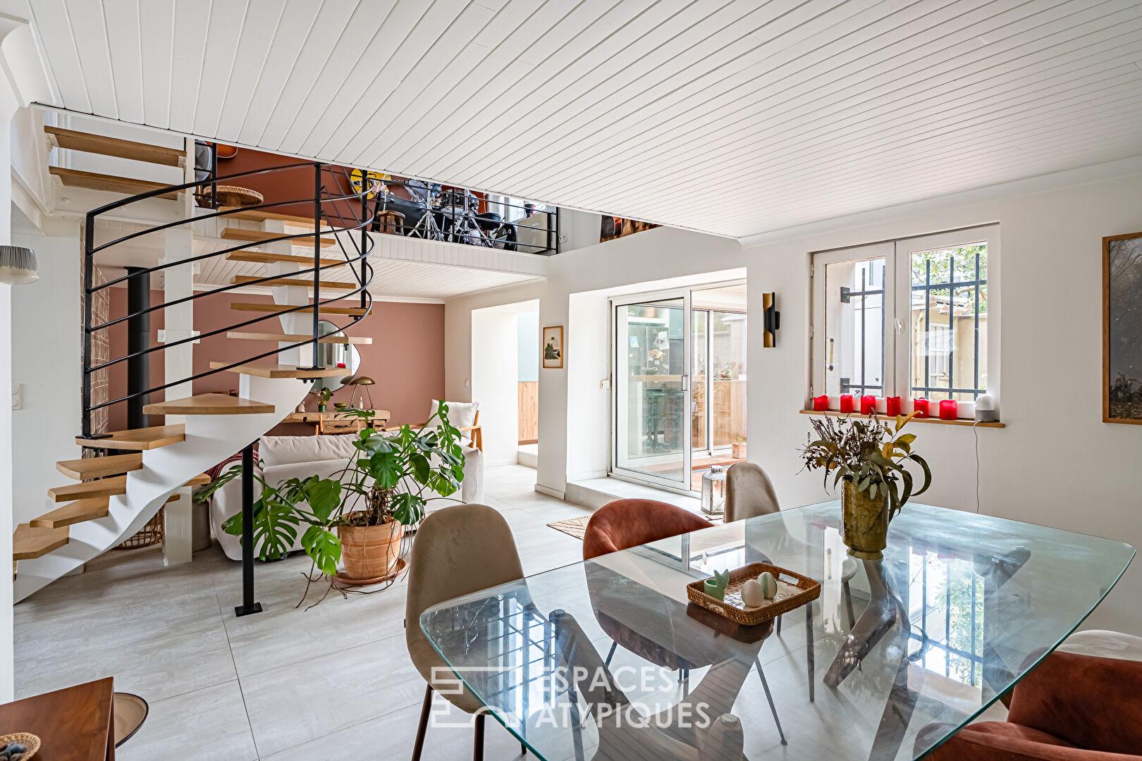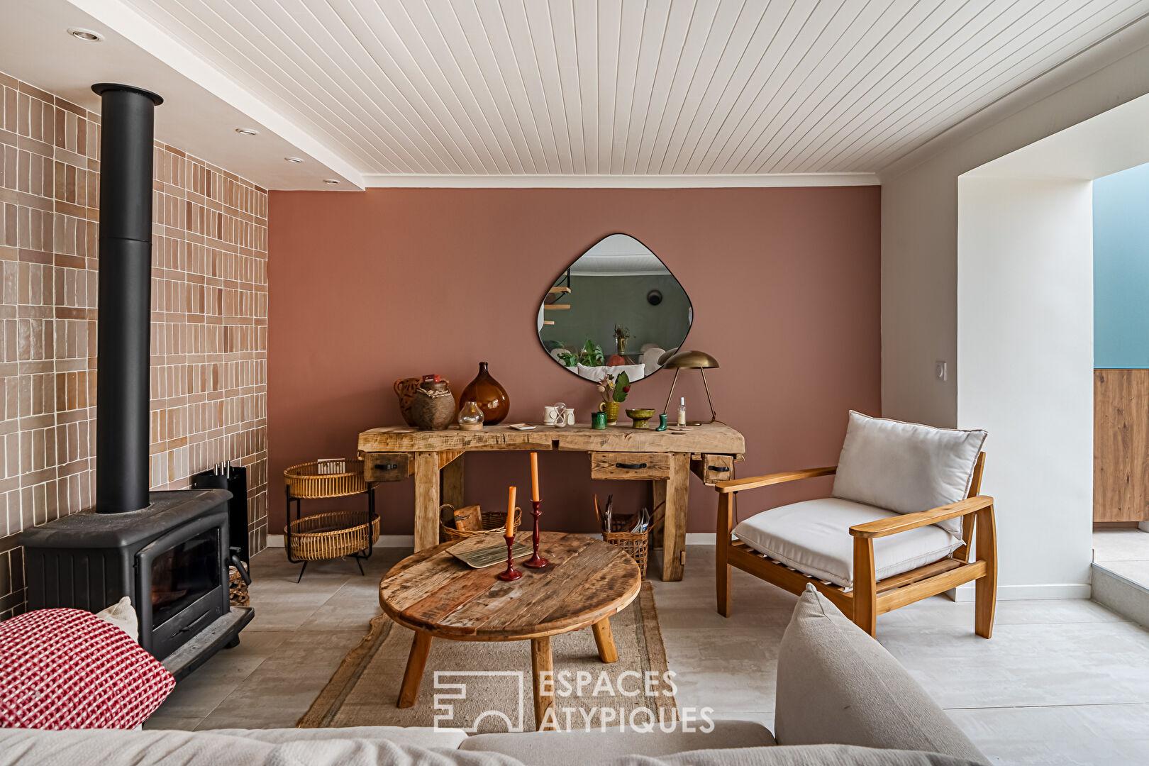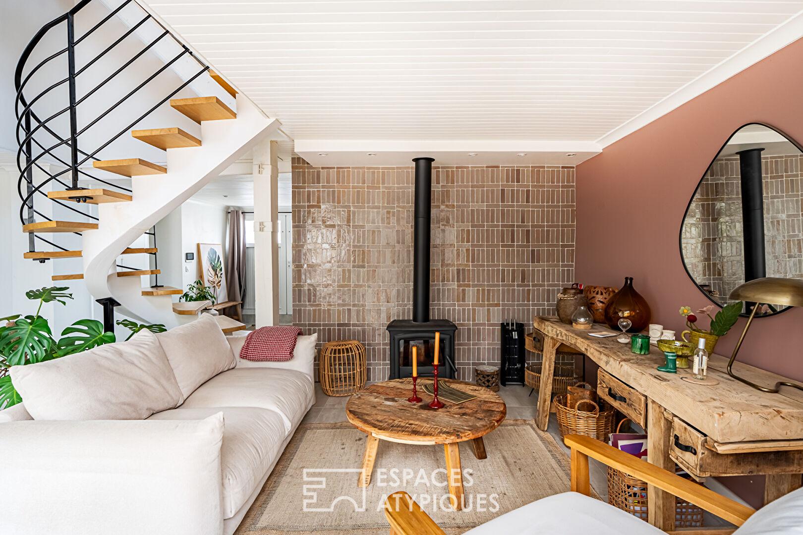 Dès l’entrée se dévoile une double réception de 29 m² avec une hauteur sous plafond de 5,18 m. L’élément central, un escalier sculptural réalisé par un compagnon, mène à une mezzanine surplombant le séjour. La salon est doté d’un poêle à bois et la décoration aux tons terracotta et vert sauge souligne une ambiance bohème-chic. Le séjour et la cuisine semi-ouverte, aux prestations haut de gamme, communiquent directement avec le patio via de larges baies vitrées.