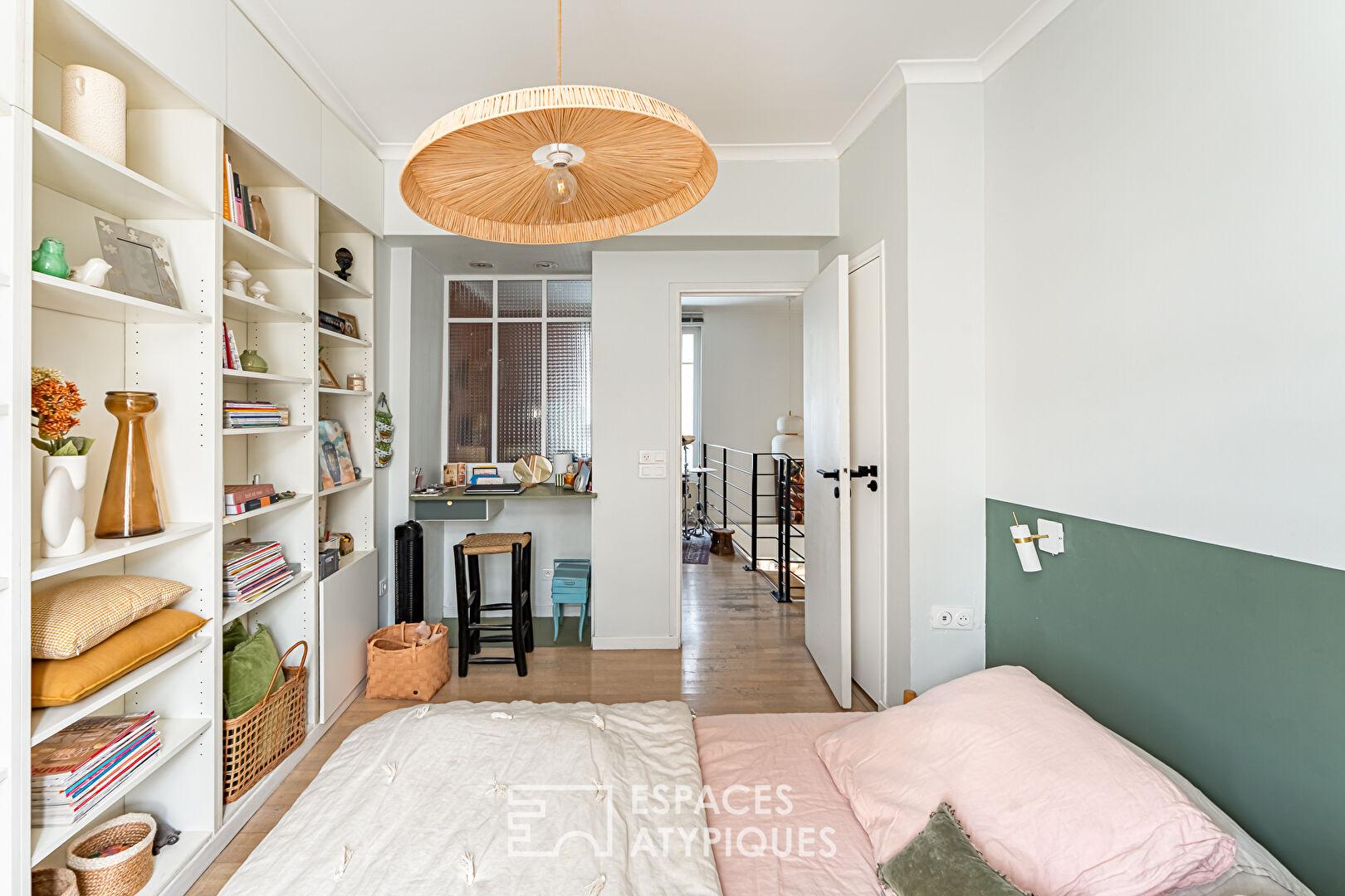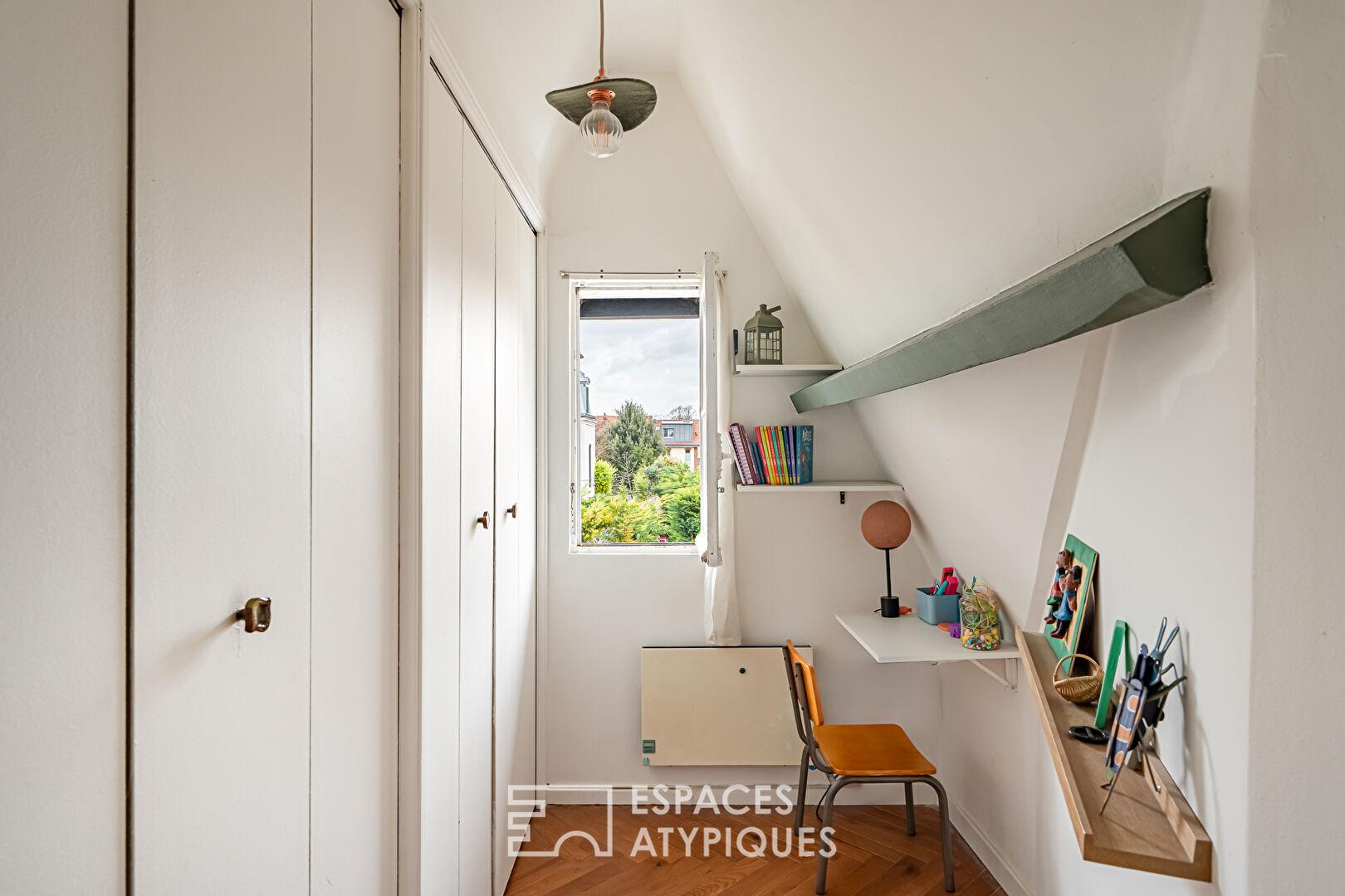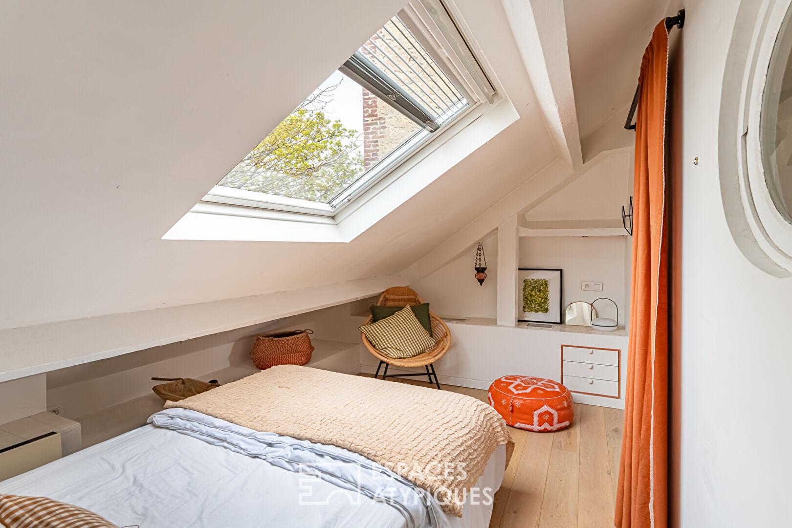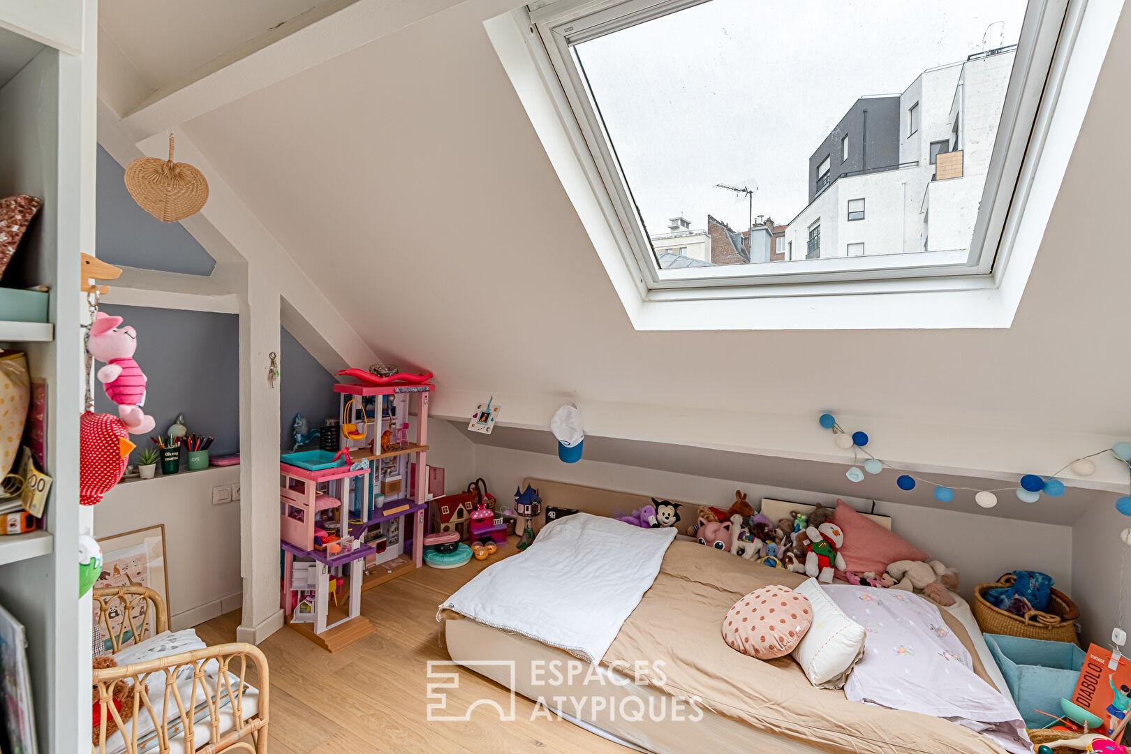 L’étage accueille une mezzanine de 10 m² et une chambre parentale avec rangements sur mesure. Le dernier niveau, sous mansardes, abrite deux espaces nuits dotés de larges fenêtres de toit, un palier aménagé avec bureau et dressing. Un espace buanderie et un bureau avec salle d’eau, en rez-de-chaussée, complètent ce plan parfaitement optimisé.