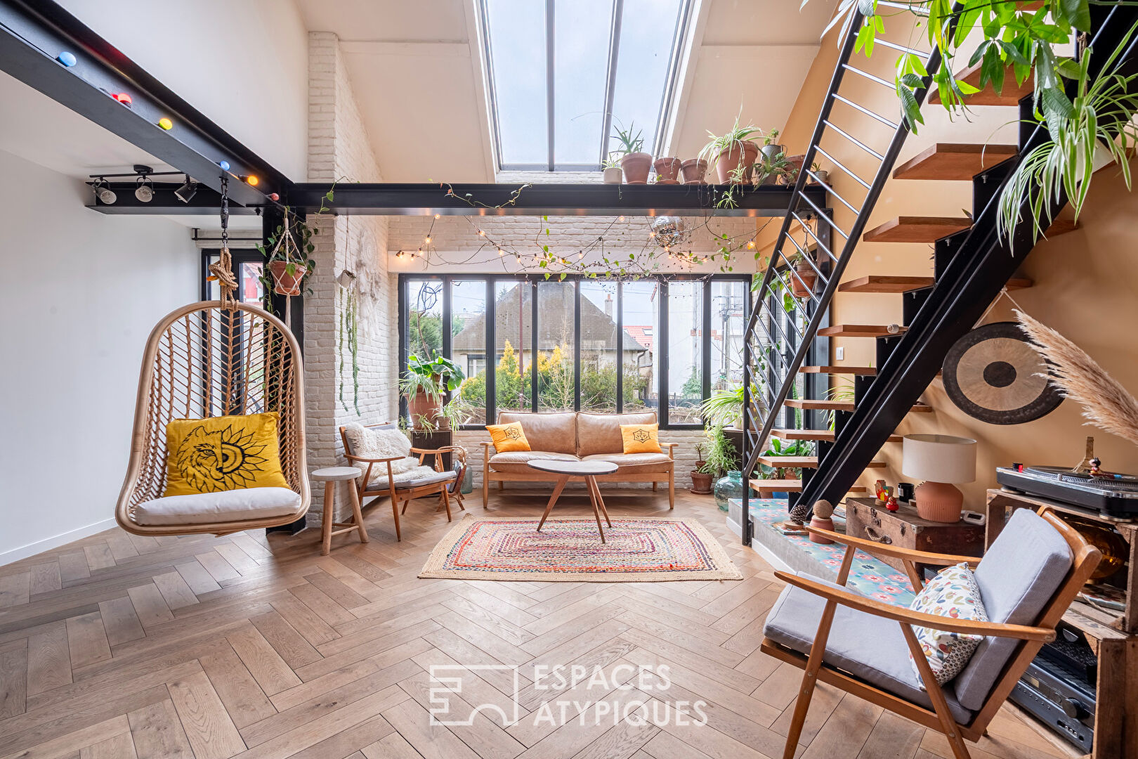A l’étage, la mezzanine surplombe le séjour, offrant un point de vue unique sur le volume principal.