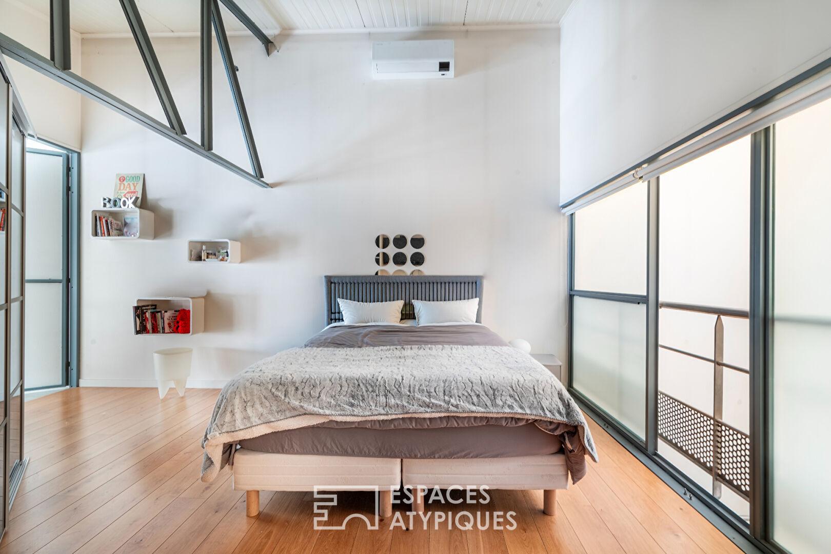 Dissimulée à l’abri des regards, au calme absolu et en retrait de la rue, cette maison singulière de 223 m² prend place dans un ancien entrepôt entièrement réhabilité au début des années 2000.