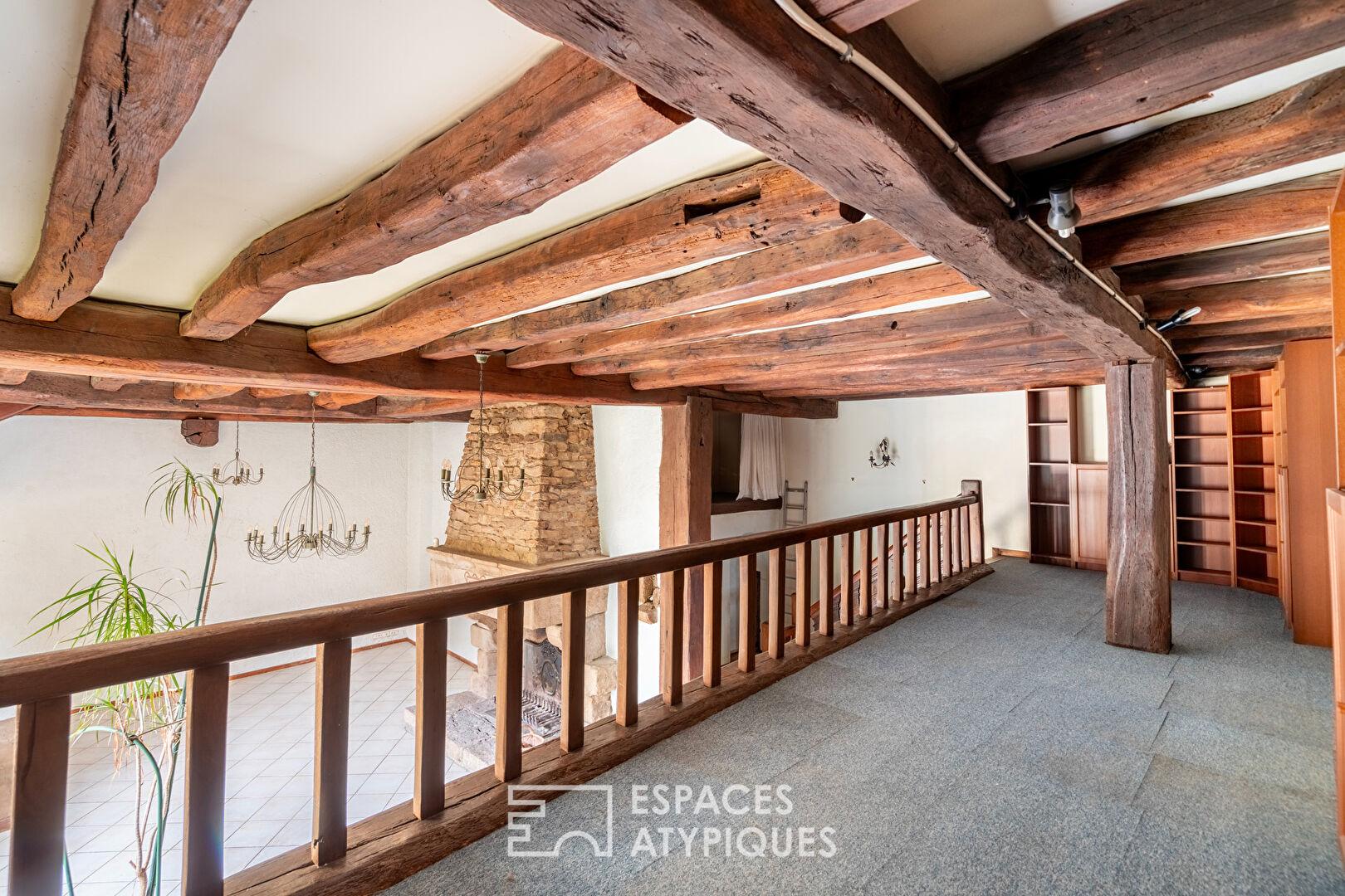 En contrebas, le salon de 76 m², véritable cœur de la maison, impressionne par sa hauteur sous plafond de 4,30 m. Il se distingue par ses poutres issues d’un manoir normand et sa cheminée d’époque ornée d’un écusson daté de 1588. Une mezzanine de 20 m² offre un espace idéal pour l’aménagement d’un bureau ou d’une bibliothèque.