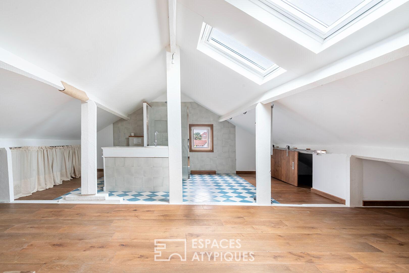 Sous les combles, une deuxième suite mansardée a été aménagée avec salle d’eau ouverte sur la chambre, le tout éclairé par deux Velux.