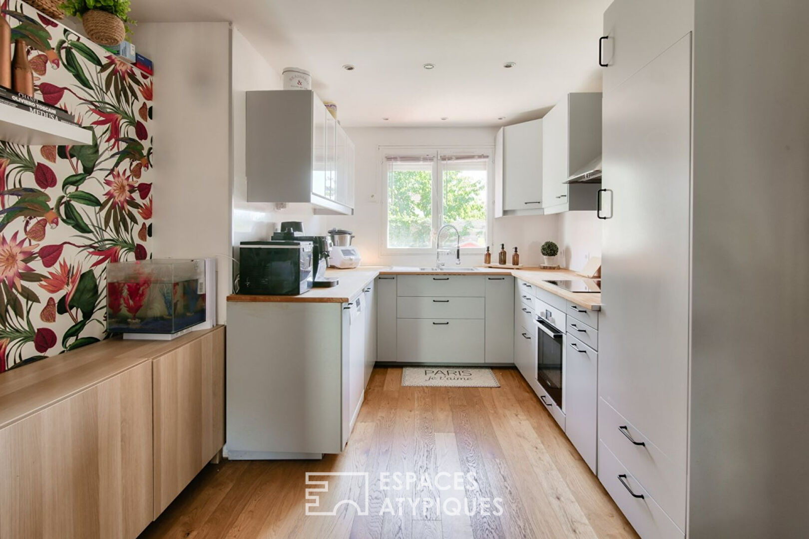 Cette maison de 108,69 m2 Carrez (120m2 au sol) sur une parcelle d’environ 420m2 se situe dans le quartier pavillonnaire du lac de Maison Blanche à Gagny, secteur résidentiel, familial et calme.