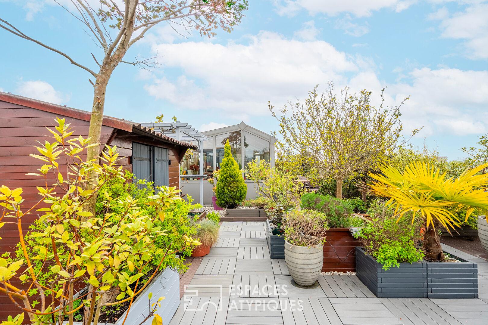 Situé aux Lilas, à proximité de Serge Gainsbourg, cet appartement à l’esprit loft de 120 m² au sol (117,22 m² Carrez) profite d’un rooftop d’environ 100 m² et d’une véranda de 15 m².
