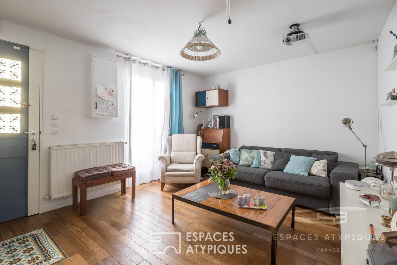 Cette maison à la décoration contemporaine et chaleureuse est située au fond de la cour pavée et arborée d’un immeuble ancien proche de la Mairie des Lilas.