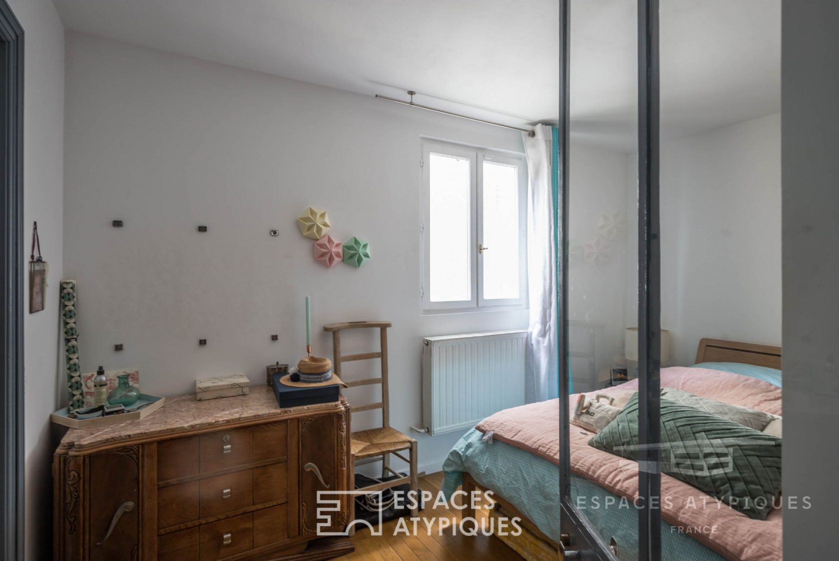 L’utilisation de verrières type atelier qui permet à la lumière de pénétrer toutes les pièces, les volets en bois à lames horizontales détournés en portes de placards, ainsi que les aménagements des différents niveaux rendent ce lieu agréable à vivre.