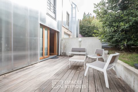 Situé entre le canal de Saint Denis et la Mairie d’Aubervilliers, ce duplex de 121 m2 (118 m2 Carrez) avec terrasse et jardinet est organisé comme une maison.