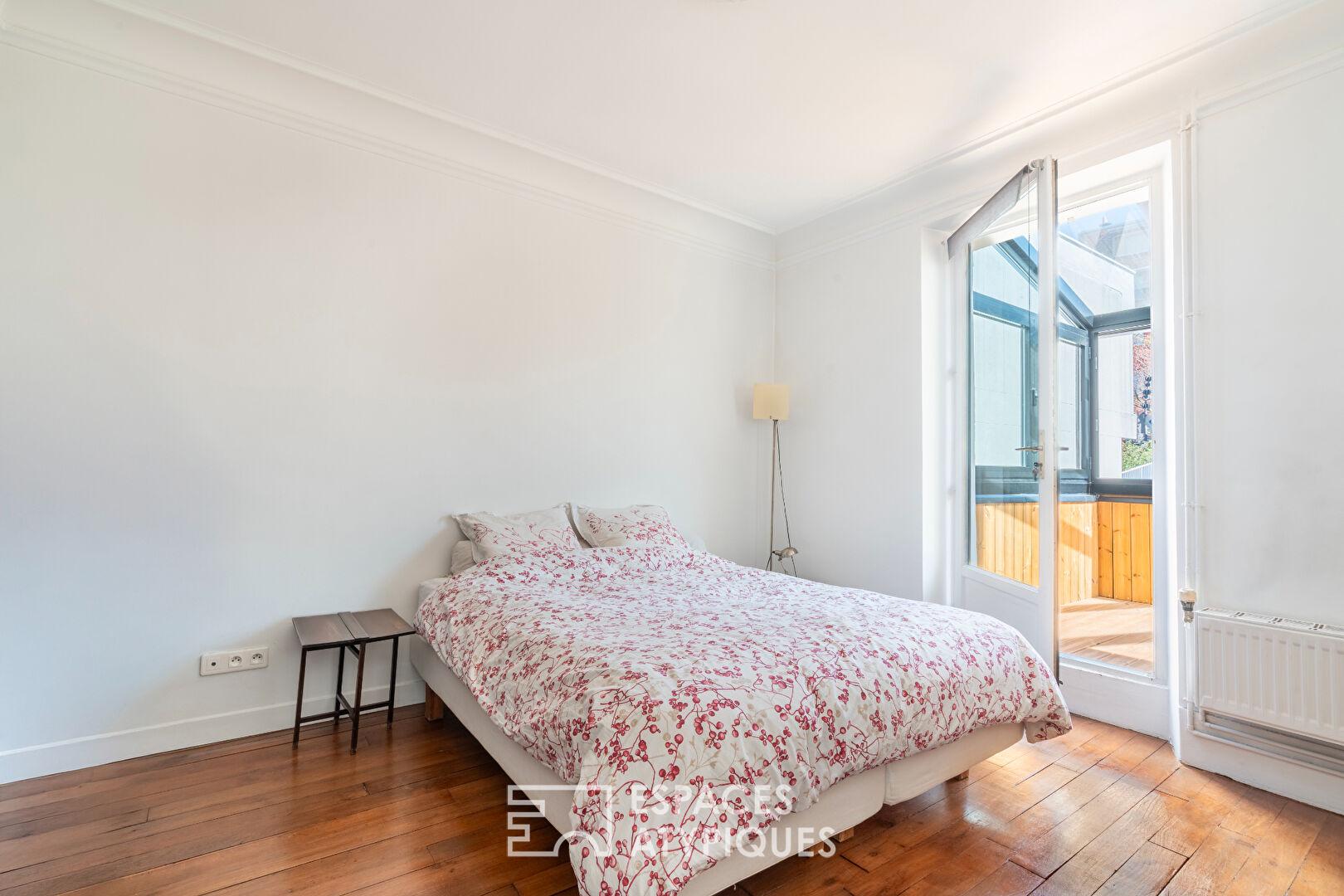 À l’étage, desservi par un escalier d’époque, deux chambres de 13 m² prennent place aux côtés d’une salle de bains avec douche et toilettes. Une véranda prolonge les perspectives et capte la lumière au fil de la journée.