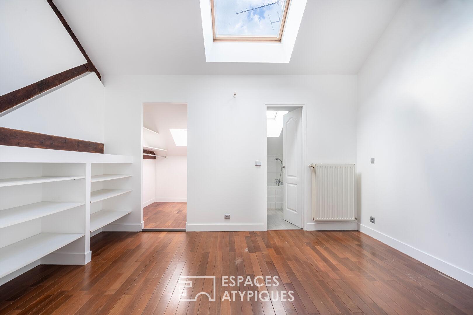 Un escalier métallique à la structure graphique, véritable pièce sculpturale, mène à l’étage supérieur. Celui-ci accueille deux suites traversantes de 17 m² et 22 m², éclairées par des lucarnes. La plus grande dispose d’une salle de bains avec WC et d’un dressing, la seconde profite quant à elle d’une salle d’eau.