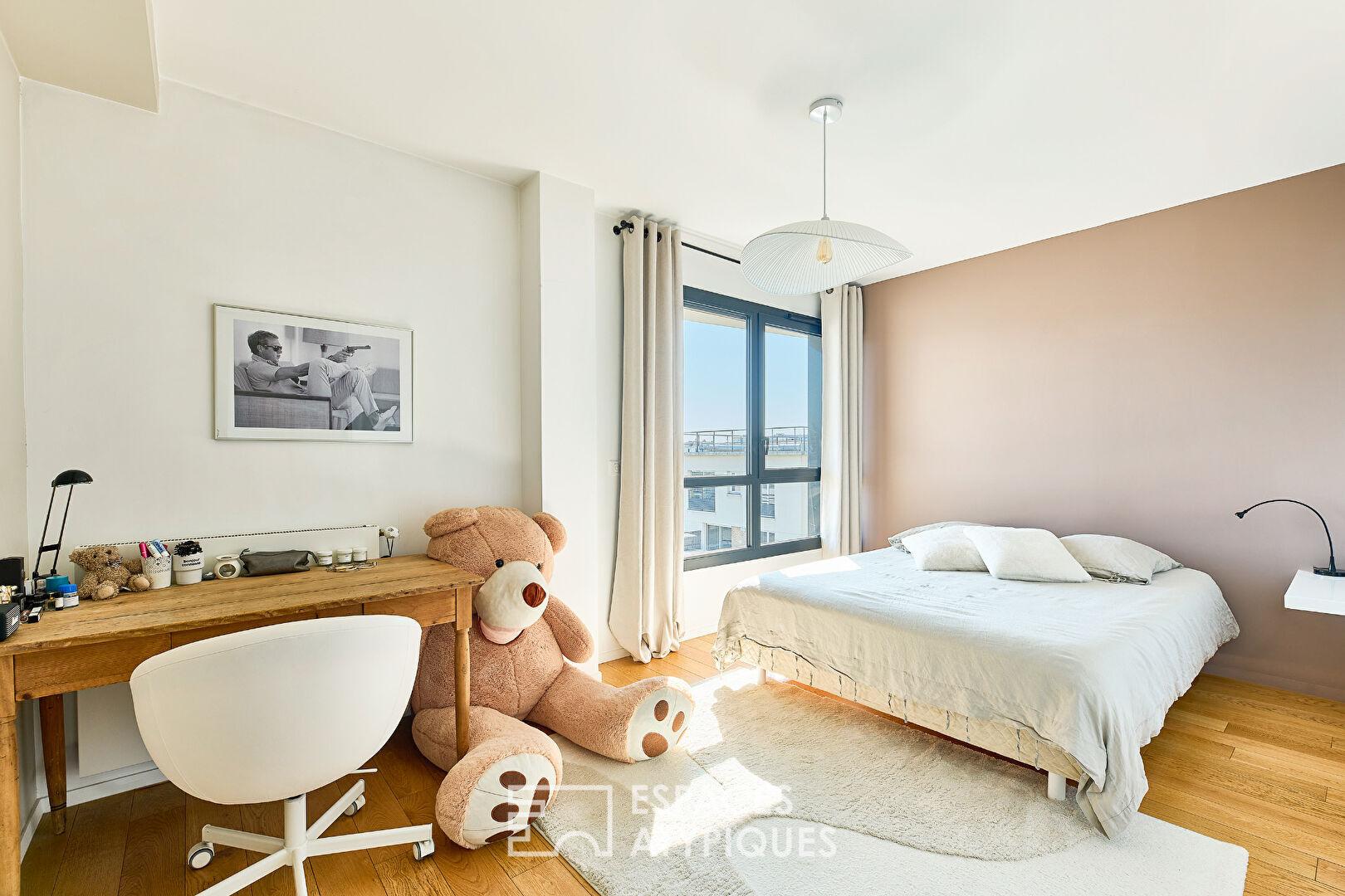 Au coeur du Triangle d’Or de Pantin, aux premières loges du canal de l’Ourcq, ce duplex d’exception de 131,60 m2 Carrez niché au dernier étage d’un immeuble de standing (2018) allie architecture contemporaine et vues cinématographiques.