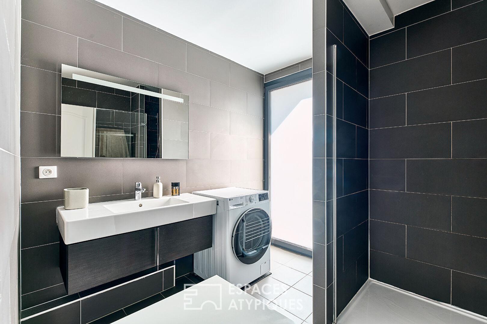 Seul à son niveau, l’appartement ouvre sur une pièce de vie de 36 m² baignée de lumière naturelle, prolongée par une première terrasse de 8 m² surplombant directement le canal. Ce volume central est complété par une cuisine ouverte et un espace dînatoire donnant sur une seconde terrasse de 16 m² plein Sud, offrant un calme absolu et un air de Brooklyn face aux lignes d’horizon.