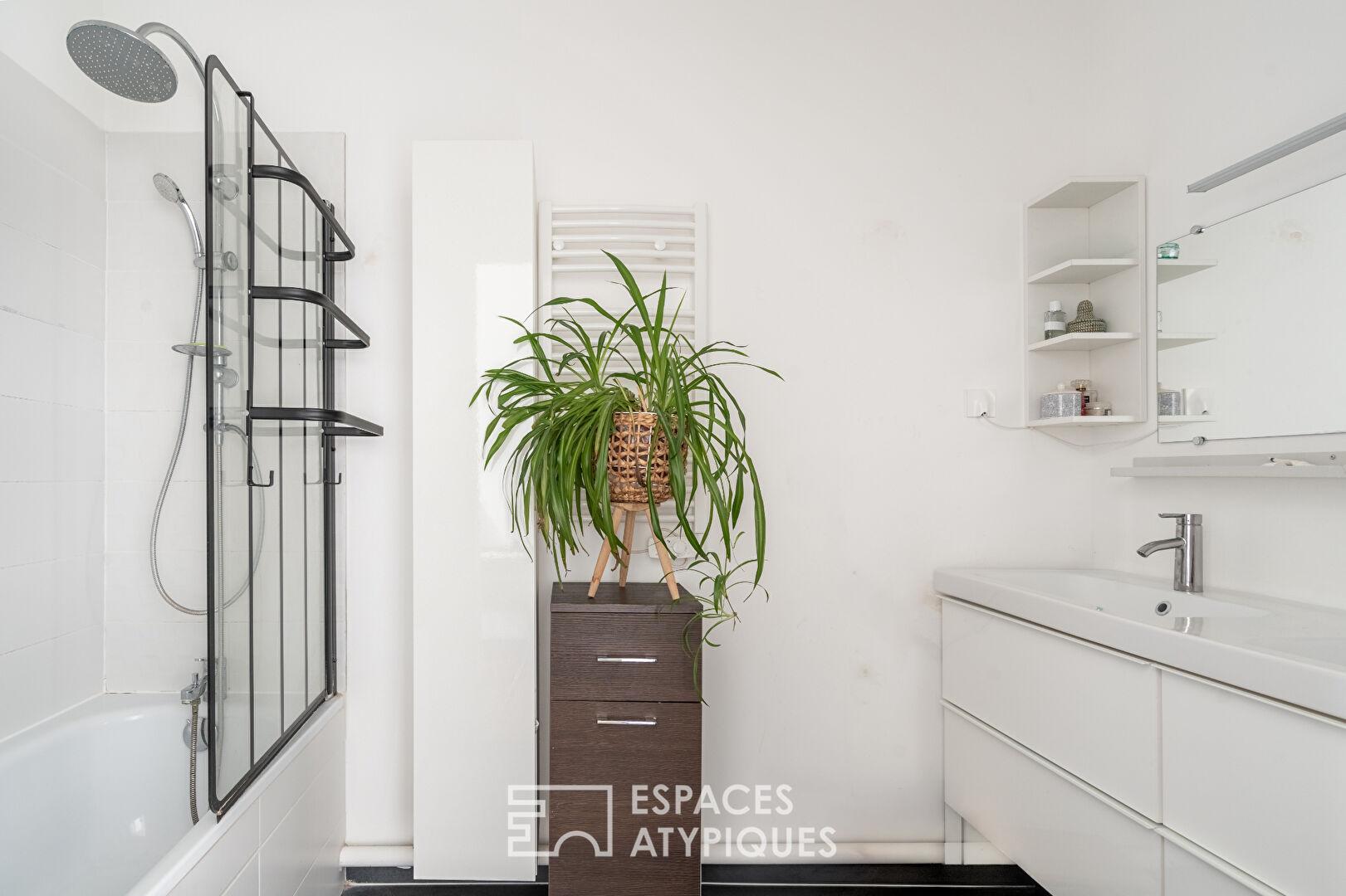 Au calme absolu, cet espace repensé par architecte bénéfice d’une hauteur sous plafond de 3,40 mètres et est éclairé par de larges verrières.