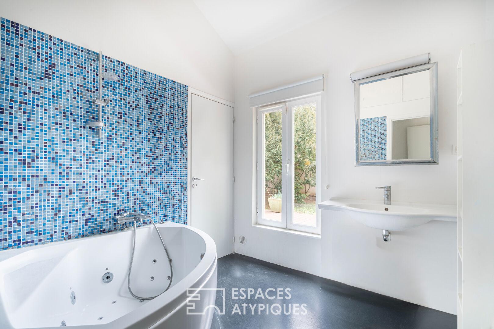 La salle de bains bénéficie d’une ouverture sur le jardin, apportant une lumière naturelle rare, et accueille une baignoire.