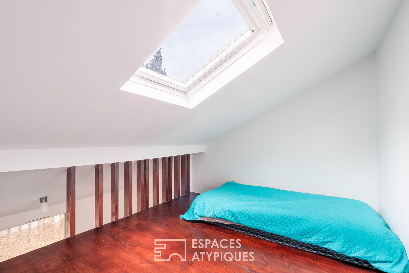 Une mezzanine exploite la verticalité pour offrir un couchage supplémentaire ou un espace de travail.