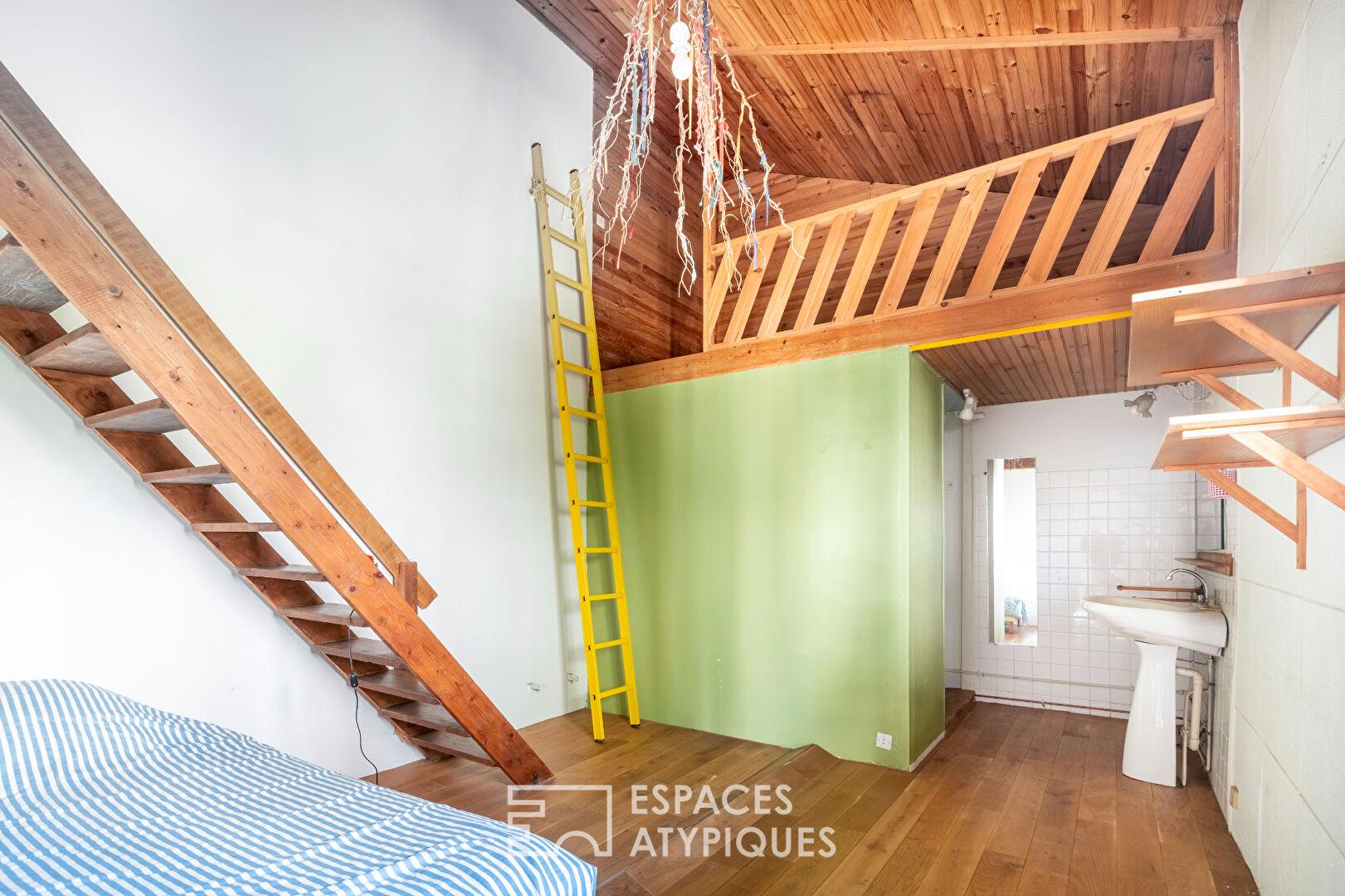 À l’étage, deux chambres aux lignes atypiques, dont l’une agrémentée de 2 mezzanines et d’une salle d’eau, composent un espace nuit intime, complété par une salle de bains indépendante.