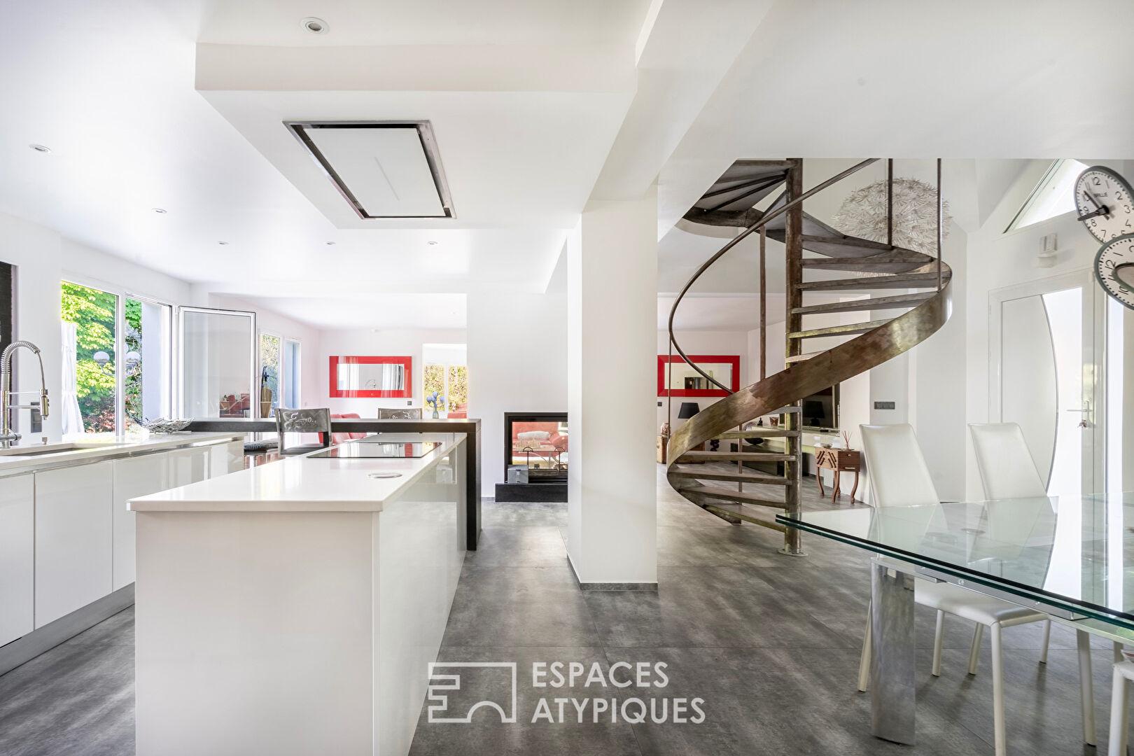 Dès l’entrée, les perspectives s’ouvrent. La pièce de vie s’organise autour d’une cheminée traversante et d’une cuisine ouverte, dans une fluidité évidente. Puis le regard est happé par ce bow-window, presque irréel, qui cadre le jardin et prolonge l’espace vers l’extérieur.
