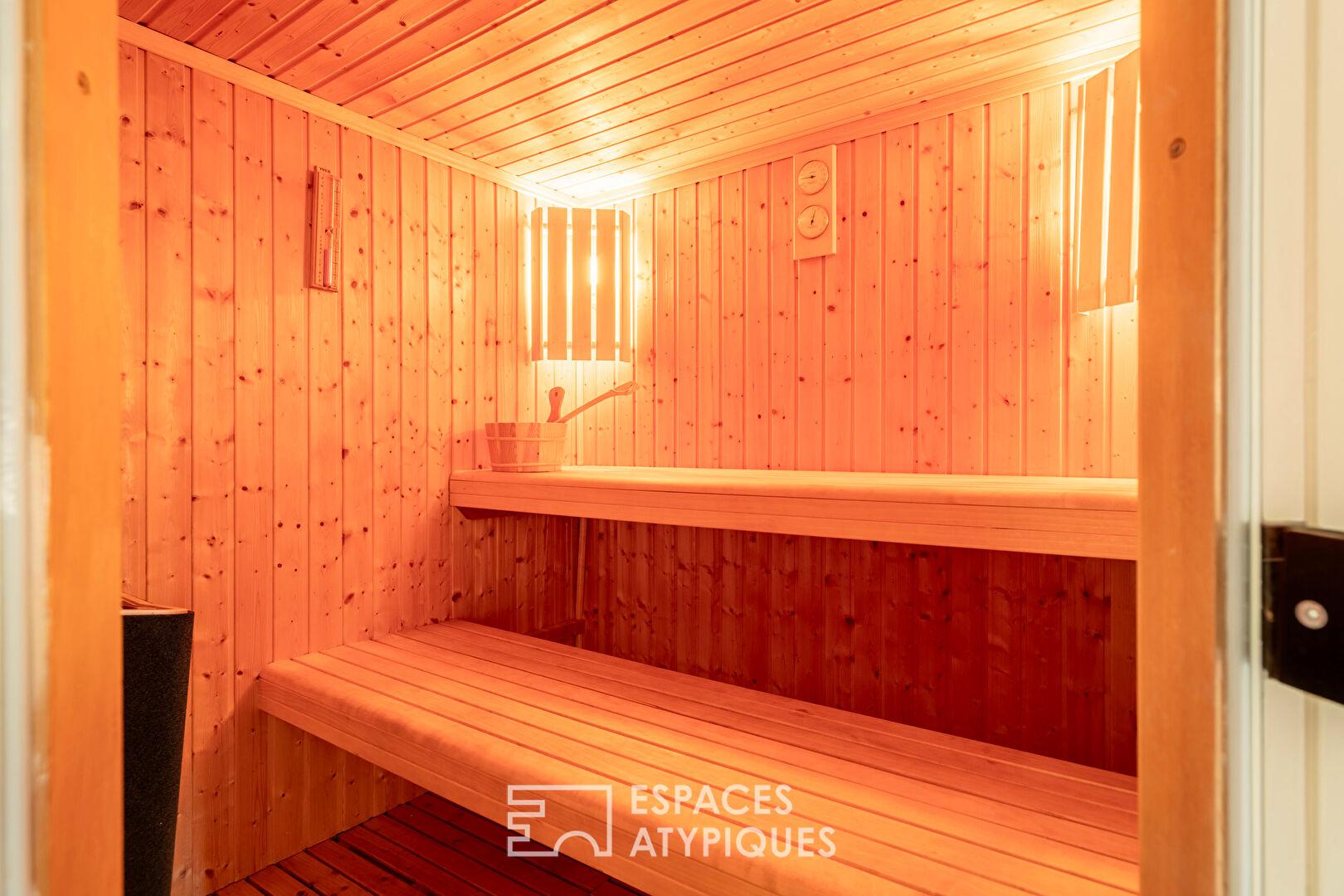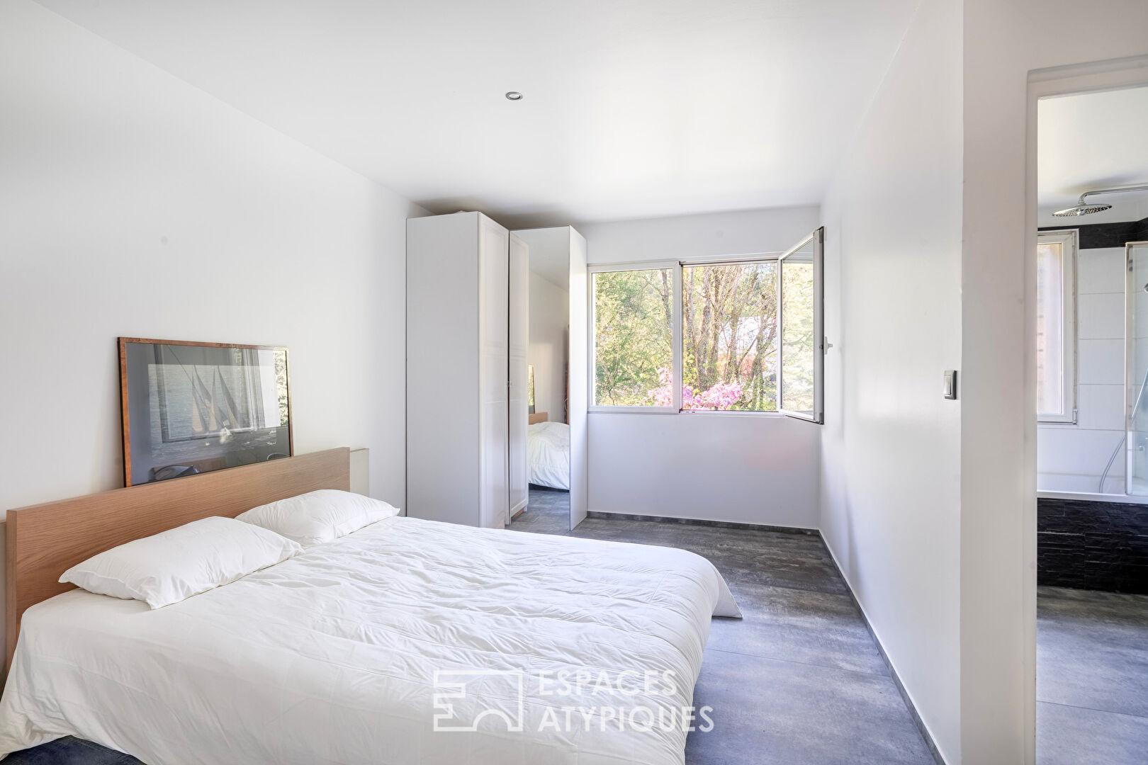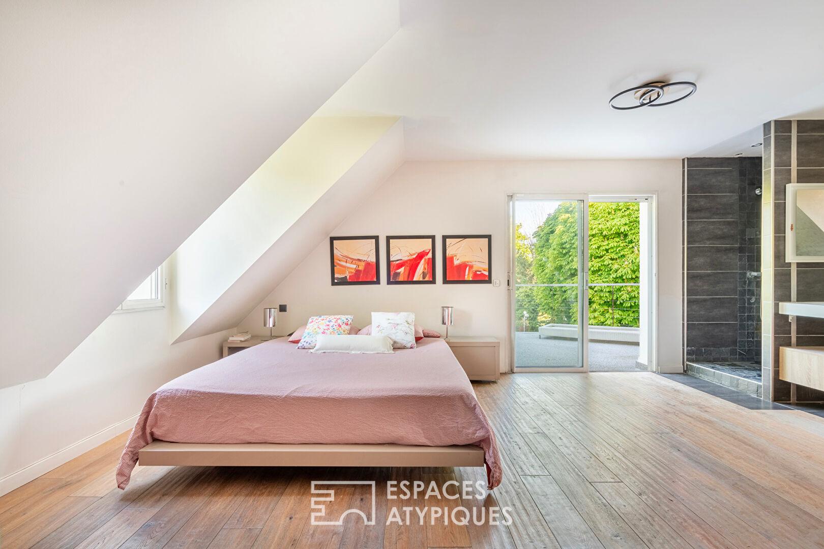 À l’étage, trois suites aux proportions généreuses, toutes équipées de leur propre salle d’eau et dressing. La suite principale se prolonge par une terrasse dominant le jardin et la piscine, pensée comme un véritable solarium, à l’abri de tout regard et enveloppé de végétation. Un sauna complète cet ensemble, prolongeant naturellement l’expérience de bien-être au sein de la maison.