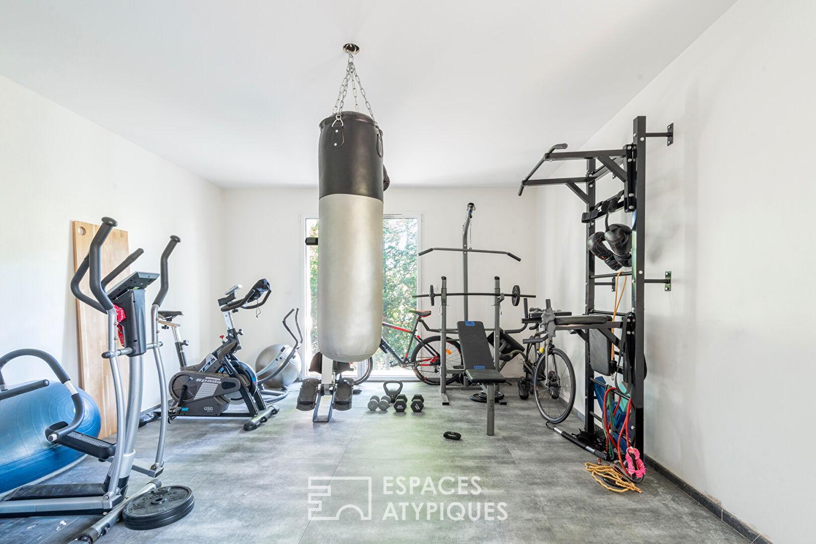 Actuellement, la maison s’organise avec une chambre et sa salle de bain au rez-de-chaussée, accompagnées d’un bureau et d’une vaste salle de sport aux volumes impressionnants.