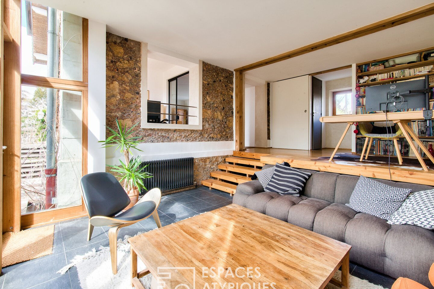 Cet espace se structure en deux niveaux ; un premier espace bureau surplombant un second salon détente agrémenté d’un poêle à bois avec vue sur le jardin arboré.