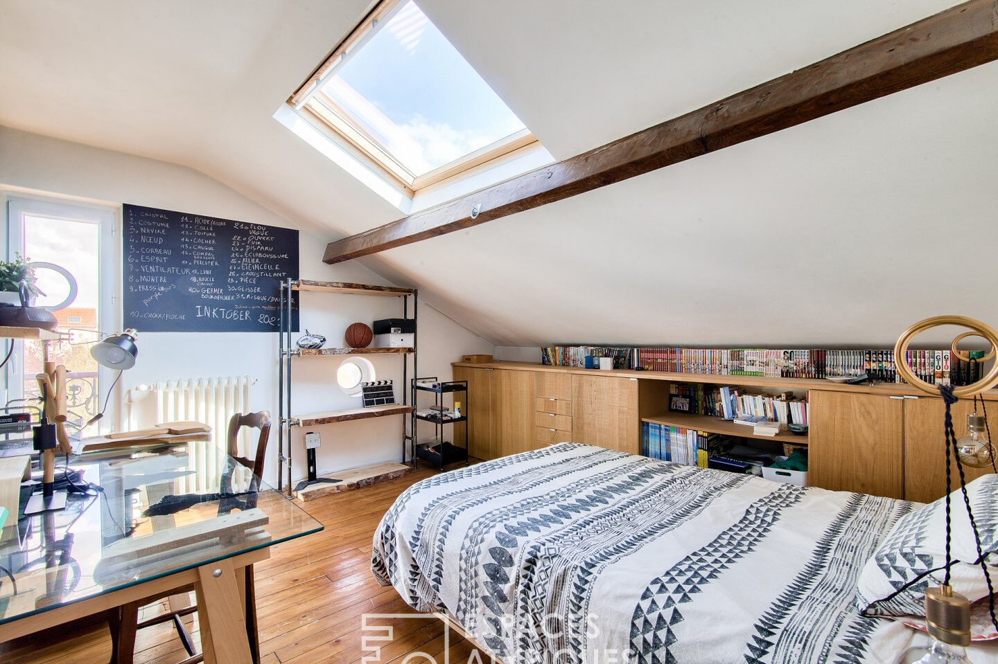 A l’opposé, un second escalier prenant naissance dans la pièce de vie dessert un niveau composé de deux chambres mansardées, un bureau ainsi qu’une salle de bains avec WC.