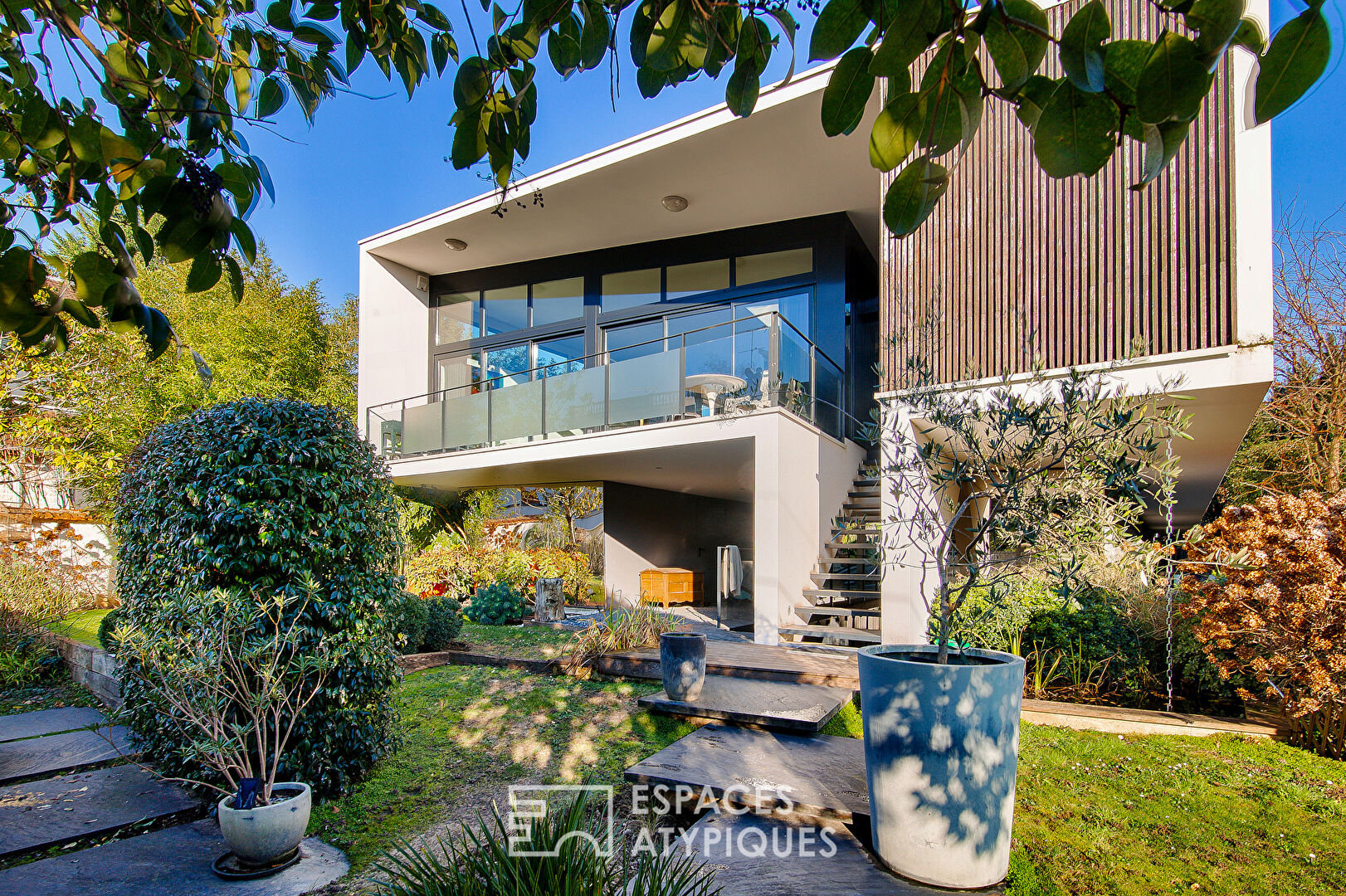 Décollée du sol aux moyens de pilotis, non sans rappeler les souvenirs corbuséens et l’empreinte de l’architecture moderne, elle est située dans le quartier unique de La Varenne Saint Hilaire, à Saint Maur des Fossés, à quelques pas des bords de Marne.
