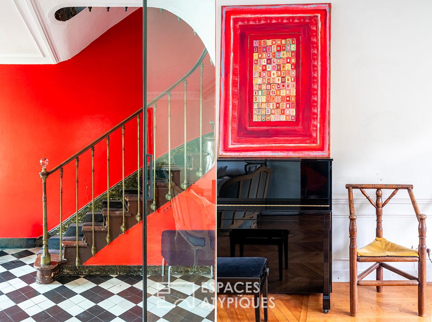 Derrière sa façade discrète, les volumes généreux se dévoilent, baignés de lumière, où les éléments d’origine dialoguent avec une écriture plus audacieuse. Parquets en point de Hongrie, moulures délicates, cheminées anciennes, tout est là. Et puis ce rouge profond qui embrase l’escalier, signature forte, presque scénographique, qui rythme la maison.