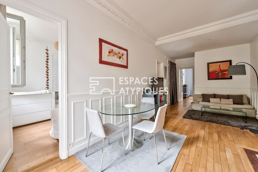 A l’orée du Bois de Vincennes et au pied du Métro « Château de Vincennes », cet appartement traversant en rez-de-jardin développe une surface de 56 m² dans un immeuble cossu des années 1930.