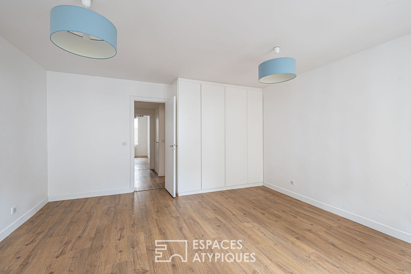 Un escalier sur mesure prenant naissance dans la pièce de vie dessert le premier étage exclusivement dédié à l’espace nuit. Ce niveau se compose d’une chambre donnant sur cour ainsi que d’une seconde chambre de plus de 22m² pouvant facilement être divisée en deux.