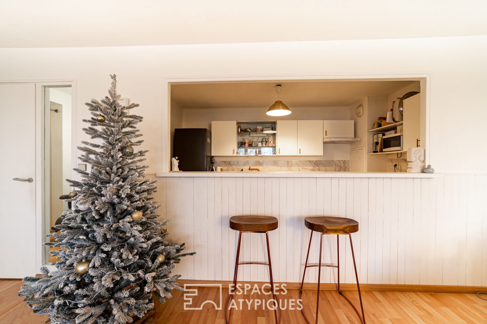 De son extérieur, se dévoilent les majestueuses douze colonnes, pièce maitresse du sculpteur Israélien Dani Karavan. A la nuit tombée, les plus rêveurs pourront s’émerveiller d’un laser surplombant l’axe majeur, la boucle de l’Oise et remontant de façon horizontale sur la capitale. Depuis l’entrée, une pièce de vie extrêmement lumineuse et sa cuisine ouverte, équipée et fonctionnelle, forment un espace de 36 m².