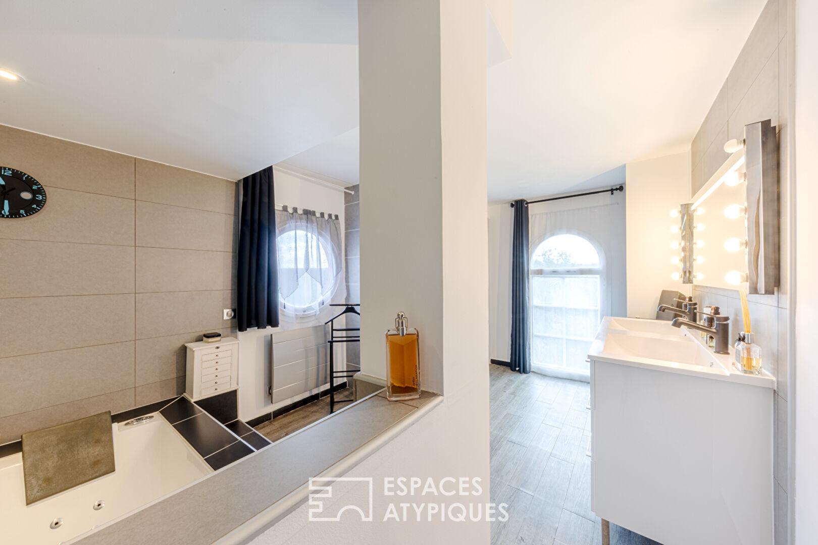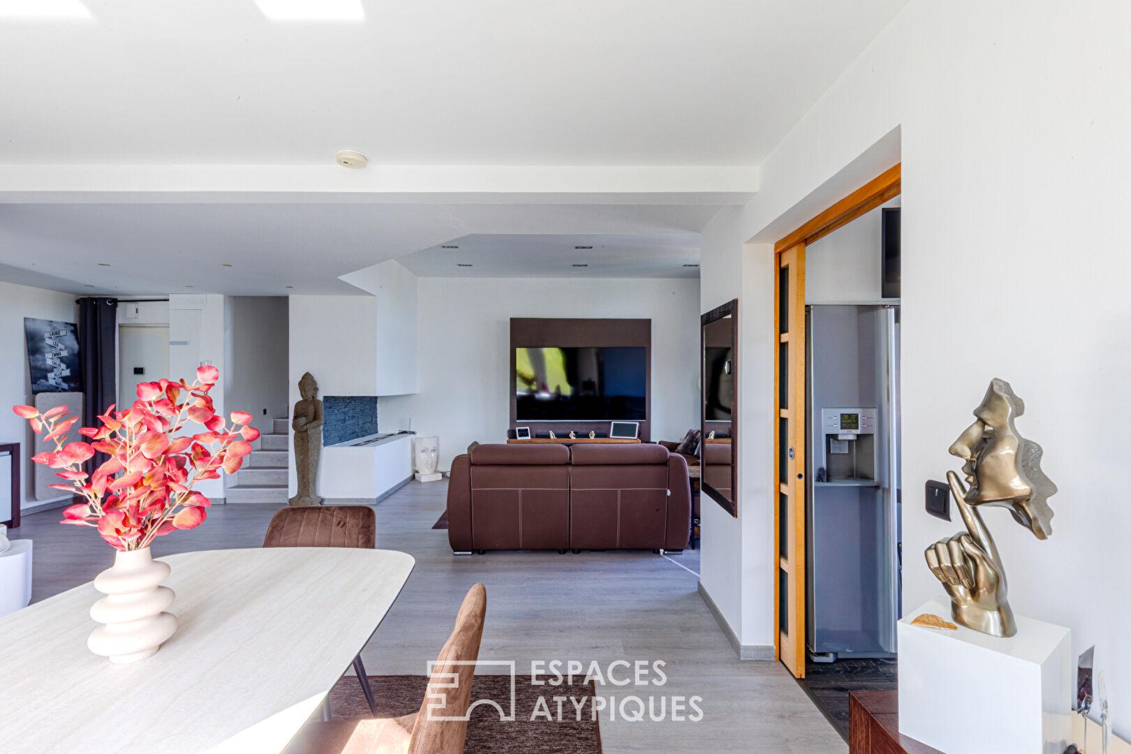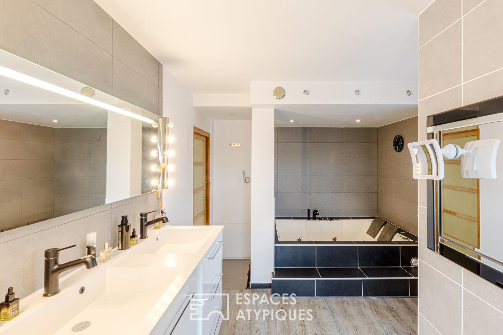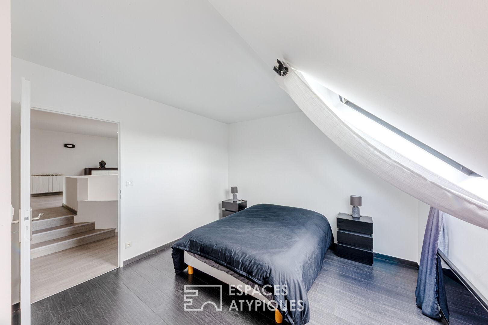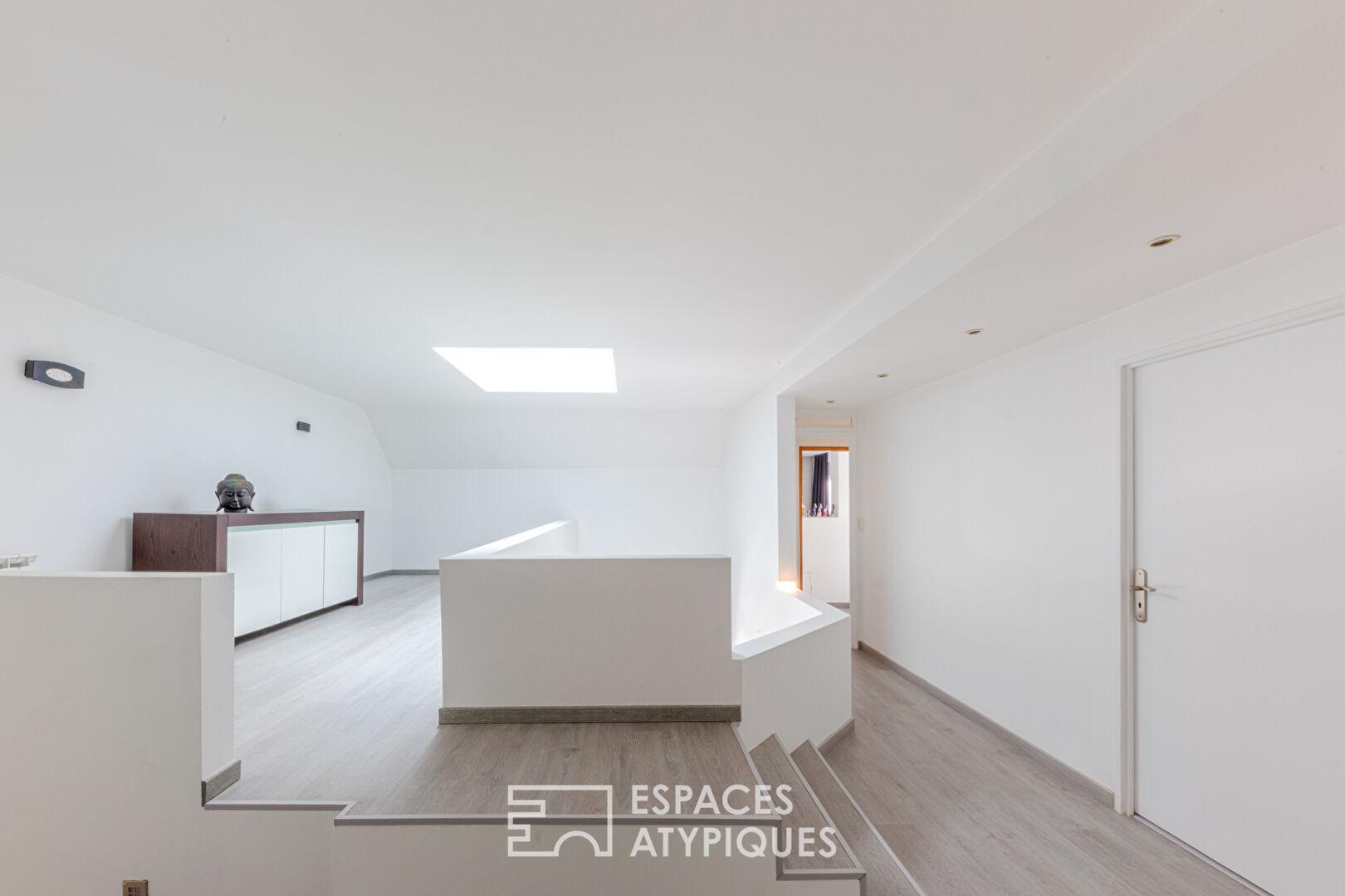 Le deuxième niveau, accessible par un escalier aux lignes aériennes, dévoile une mezzanine magistrale. Cet espace versatile, idéal pour un atelier d’artiste, un bureau inspirant ou une troisième chambre, surplombe le séjour. Il dessert une suite de 17 m², un dressing sur-mesure aux dimensions généreuses et une buanderie discrète.