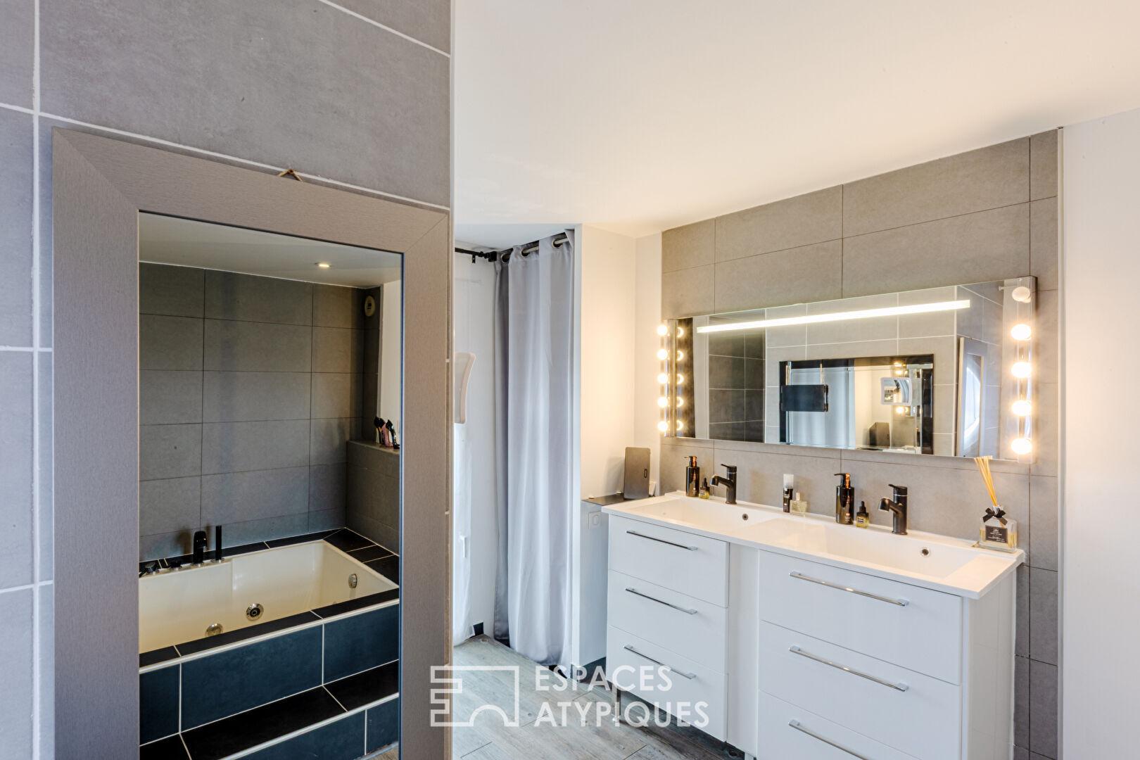 Le dernier étage est dédié à la suite parentale, véritable sanctuaire de 23 m². Ici, la vue devient panoramique, offrant un tableau vivant sur la marina. La salle de bains attenante, avec sa baignoire balnéo et sa douche à l’italienne, invite à la détente absolue dans un décor minéral et raffiné. Des combles aménagés complètent ce niveau, offrant un potentiel de rangement ou de cocon secret supplémentaire.