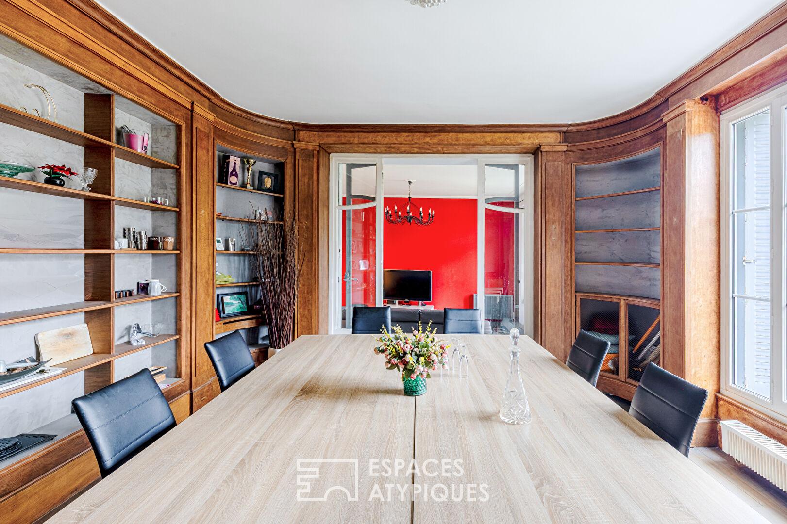 Dès l’entrée, les volumes généreux et la belle hauteur sous plafond confèrent à l’appartement une élégance naturelle. Baigné de lumière grâce à de larges ouvertures donnant sur la terrasse et le jardin, le salon sublimé par ses carreaux de ciment, s’ouvre harmonieusement sur la salle à manger. Celle-ci est agrémentée de rangements sur mesure courant sur tout le pourtour, évoquant l’âme d’une bibliothèque ancienne et raffinée. La cuisine indépendante et aménagée ainsi qu’un wc indépendant complètent ce niveau.