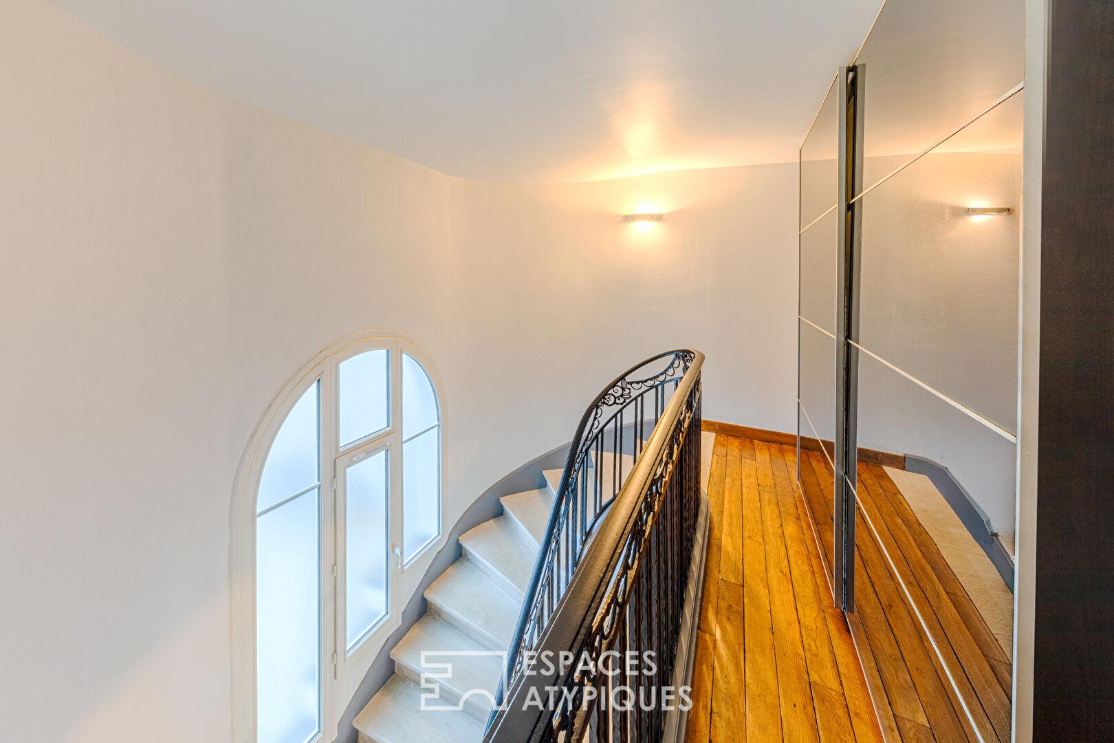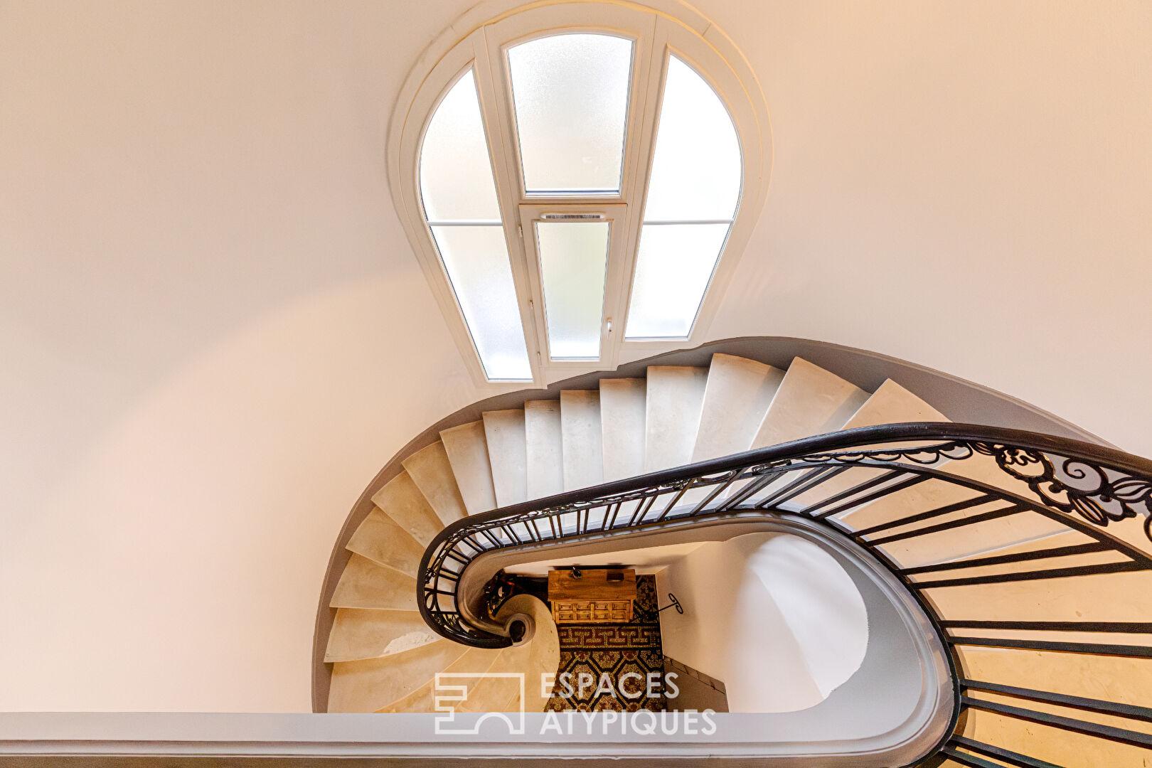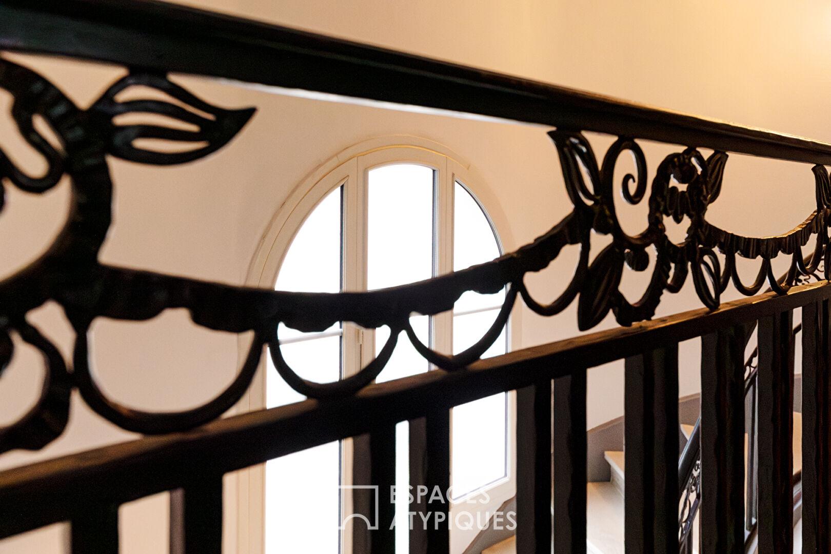 Un superbe escalier en pierre, accompagné de sa rambarde en fer forgé à inspiration classique, avec une touche Art nouveau/belle époque, mène à l’étage et renforce le cachet authentique du lieu.