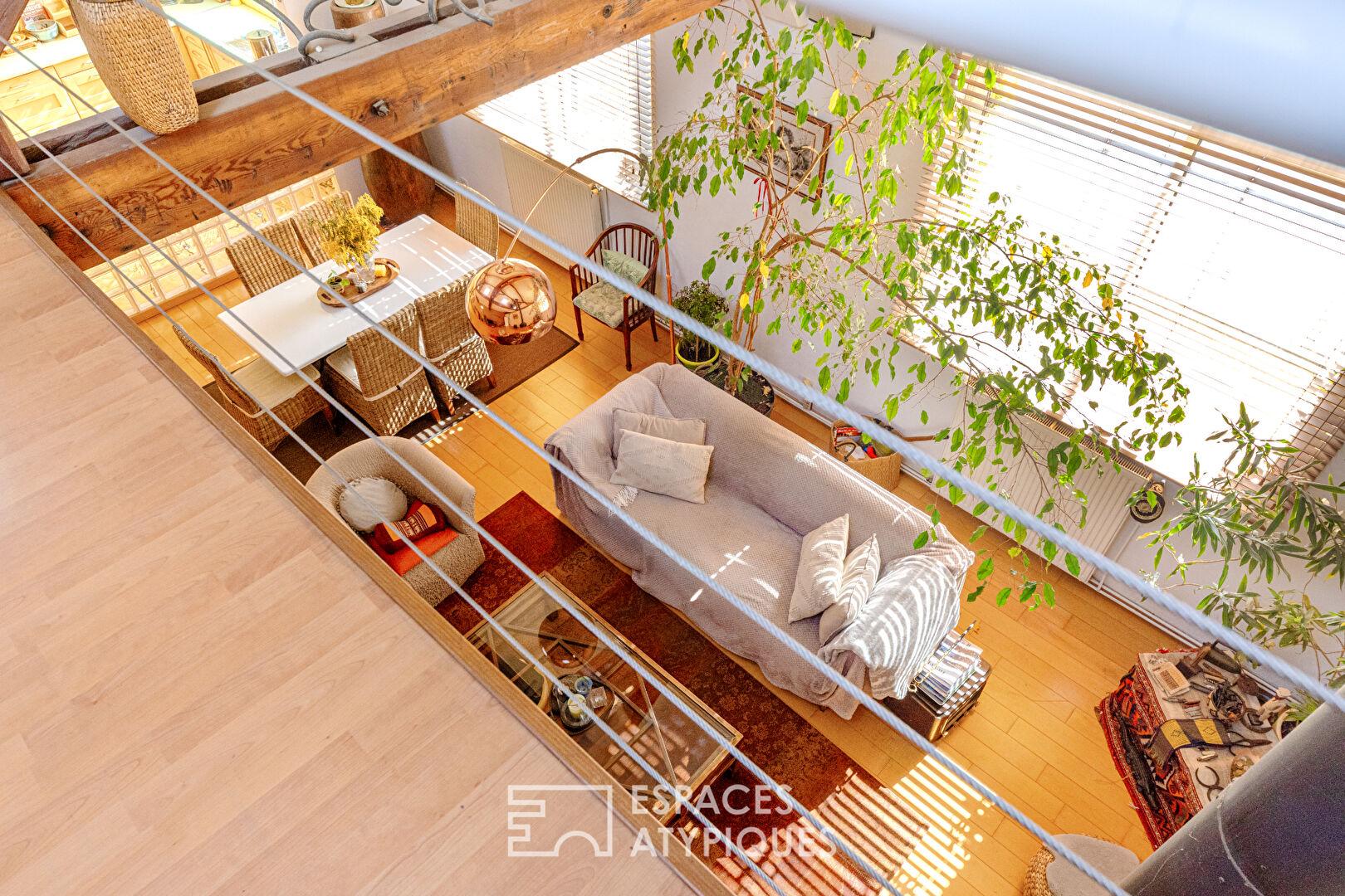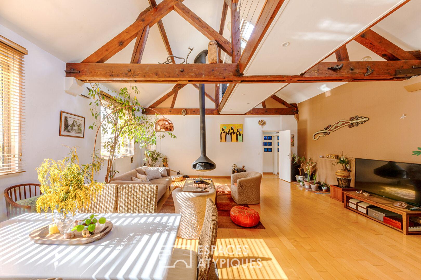 Dès l’entrée, la magie des volumes cathédrale et la signature architecturale du lieu opèrent instantanément. La pièce de vie monumentale de 74 m² saisit par sa hauteur vertigineuse et sa charpente d’origine apparente, témoin du passé historique de la bâtisse. La lumière traverse généreusement l’espace, mettant en majesté une cheminée suspendue qui réchauffe l’atmosphère. Une passerelle d’architecte, véritable trait d’union aérien, survole le séjour pour distribuer les espaces nuit, apportant une touche graphique et résolument contemporaine à l’ensemble.