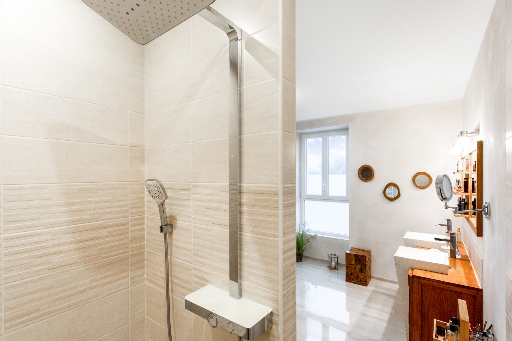 Le hall d’entrée offre un premier salon d’accueil. Dans son prolongement, un bureau, un salon télé-cinéma, un débarras, une chambre parentale et sa salle d’eau rejoignent l’espace de vie du rez-de-chaussée. Ce dernier, d’une surface de plus de 100 m2, dispose d’une cuisine équipée, d’un salon et d’un séjour sous une hauteur confortable et bénéficie de larges baies vitrées qui inondent la pièce de lumière. Une mezzanine cosy plonge sur la salle de réception et l’extérieur.