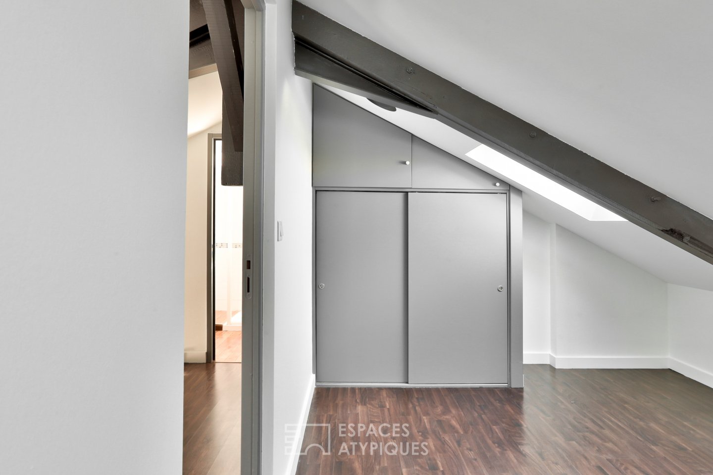 L’espace nuit à l’étage se compose d’une chambre profitant de sa salle d’eau et de son agencement intégré. Un espace bureau/coin nuit supplémentaire complète la distribution.