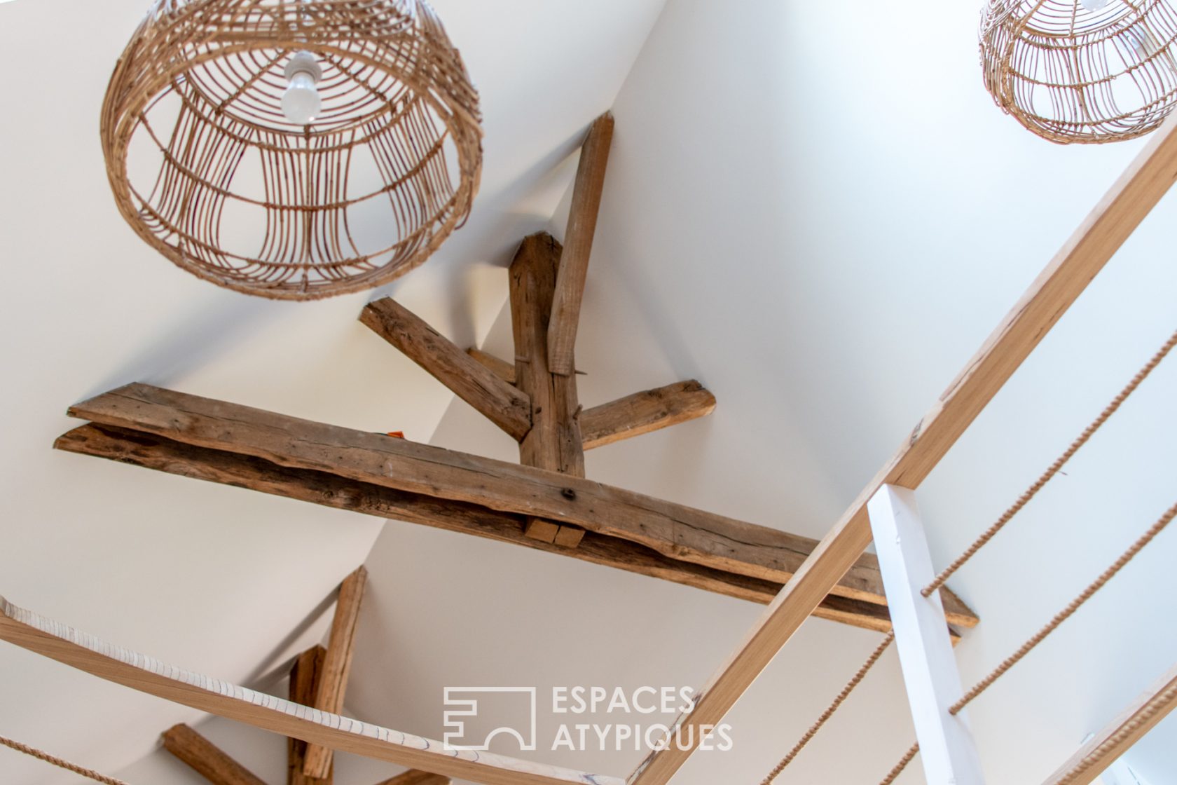 Un escalier bois mène à l’étage et s’ouvre sur une vaste mezzanine qui bénéficie d’une belle hauteur sous plafond de type toit cathédrale. D’une part, une suite parentale est accessible par une passerelle qui marque l’identité du lieu. D’autre part, un dégagement dessert deux chambres supplémentaires et une salle de bains.