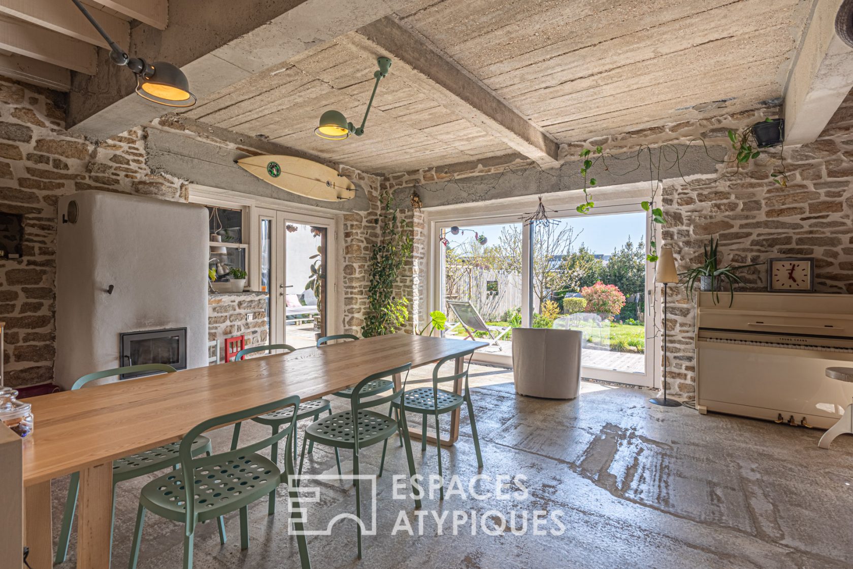 La pièce principale dispose d’une cuisine ouverte sur un espace convivial dinatoire jouxtant le salon, prolongé d’un coin lecture cosy et authentique. La pierre semblable aux pierres de Pont Réan s’apparie parfaitement au bois ornant une grande partie des pièces de vie. Ce mariage créé une ambiance chaleureuse, atypique et actuelle.