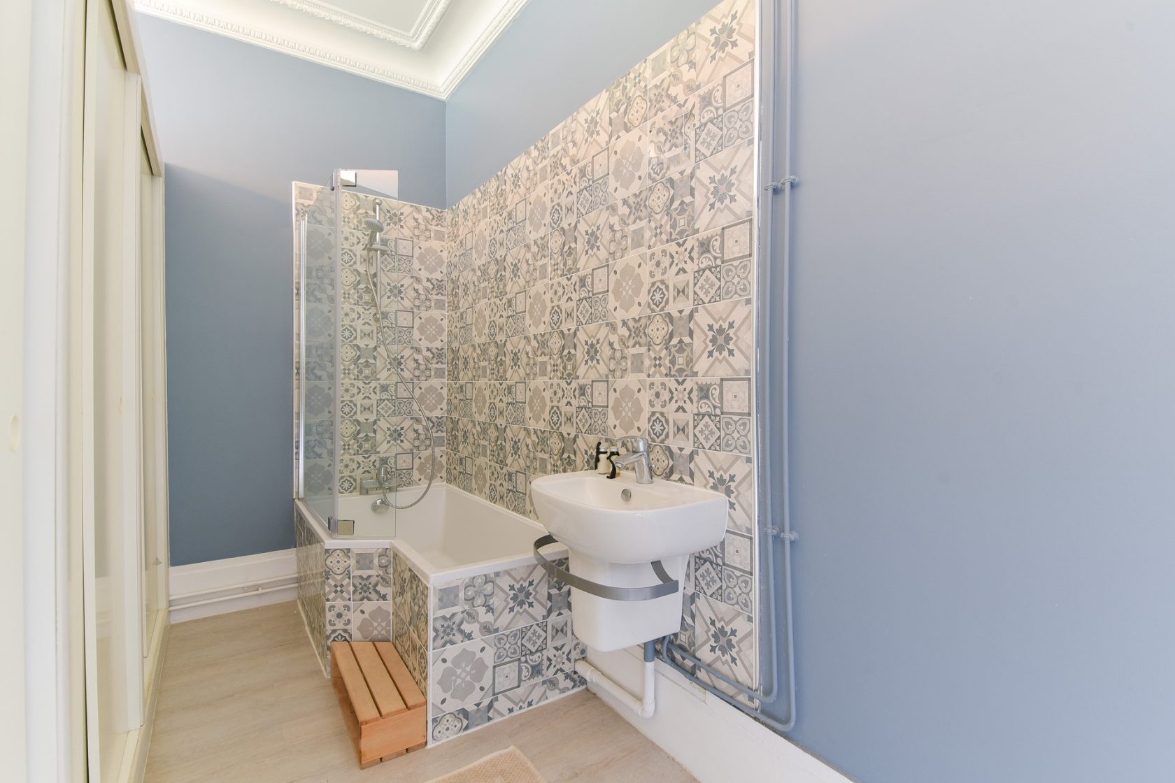 A la suite du petit salon, la pièce de réception agrémentée de carreaux ciment authentiques, et baignée de lumière, bénéficie d’un espace cuisine et d’une buanderie avec placards toute hauteur, de 16 m2 complémentaires.