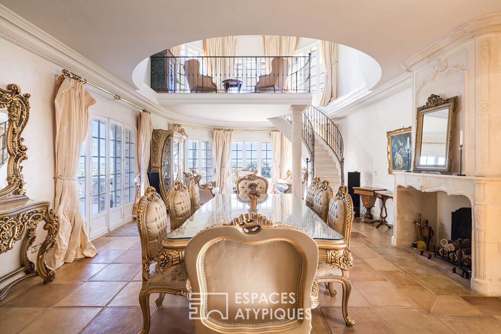 Les pièces de réception, articulées entre salon et séjour, bénéficient d’une atmosphère chaleureuse et d’une belle hauteur sous plafond, renforcée par la présence d’une seconde tour qui confère au lieu toute sa singularité.
