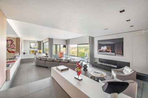 Côté extérieur, cet écrin contemporain est entouré de terrasses, à l’abris des regards. La terrasse principale, dans le prolongement de la pièce de vie, est à la fois un lieu de partage mais aussi de contemplation sur la vue panoramique.
