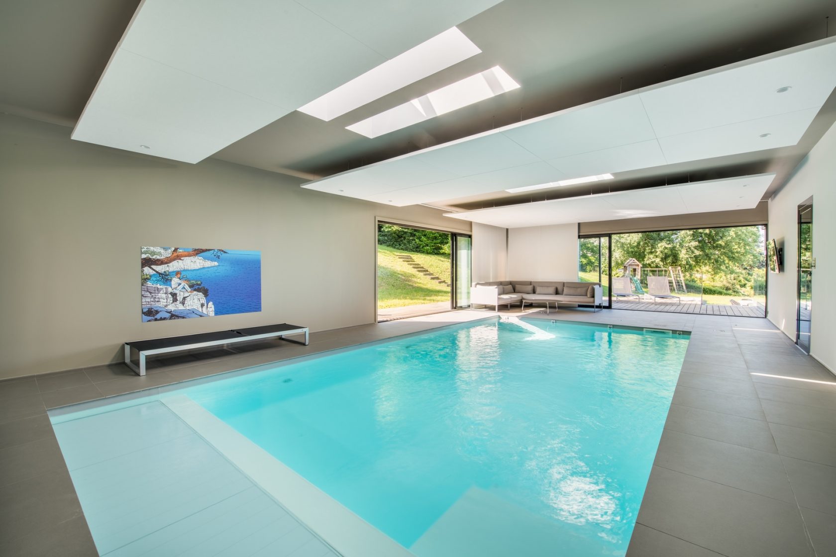 En retrait des pièces à vivre, au détour d’un couloir anonyme, la piscine intérieure trouve idéalement sa place afin que les joies de la baignade ne soient plus une question de saison.